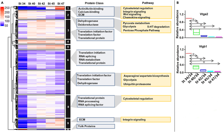 Figure 3. Temporal proteome dynamics during otic development(A) Hierarchical clustering analysis supplemented by k-means clustering, cluster numbers indicated in adjoining black bars. Overrepresented GO categories for dynamic clusters for protein class (blue) and pathway (yellow) are shown.(B) Relative quantification of yolk protein fragments Vtga2 and Vtgb1 over developmental stages when maternal yolk proteins are metabolized. ∗, p < 0.05 (ANOVA). See also Table S1.