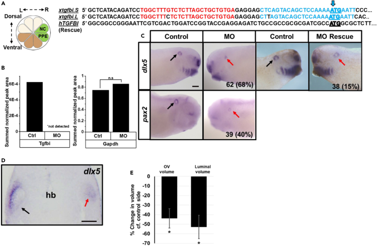 (B and C) Targeted MS analysis shows Tgfbi protein is not detected in OVs dissected from the MO injected sides of stage 34 larvae. Abundance of the reference protein Gapdh does not change significantly following Tgfbi KD (paired Students t test, p > 0.05) (C) MO injected embryos cultured to stage 32 and processed by ISH for dlx5 and pax2. While OV gene expression was normal on the control side (black arrow), it was greatly reduced on the MO-injected side (red arrow) of same larva in a large percentage of the cases (n = 63 larvae for dlx5, n = 39 larvae for pax2). Embryos injected with Tgfbi MOs plus the MO-insensitive human TGFBI mRNA showed a significantly reduced percentage of reduced dlx5 expression (p < 0.05, Chi-Squared test), demonstrating rescue of the morphant phenotype. MO: morpholino injection; MO Rescue: MOs + hTGFBI mRNA injection. Bar indicates 200 m.