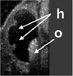 optical coherence tomography-based images of the otic vesicle in X. laevis embryo at NF stage 45/46, in which the protrusions that will form the horizontal canal grow further inward and stereocilia bundles on hair cells are very distinct (5 m in length). [key Otolith (o), pouch and protrusions for the horizontal canal (h); scale bar = 100um]