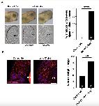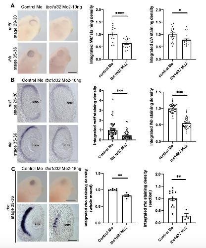 Supplemental Figure 9. ihh expression following tbc1d32 Mo and mRNA co-injection. Whole mount in situ hybridization against ihh on stage 35-36 embryos injected with standard Mo, tbc1d32 Mo1, tbc1d32 mRNA, and tbc1d32 Mo + tbc1d32 mRNA (lateral view of the head, anterior to the right). Scatter plot with bars represents the quantification of ihh staining integrated intensity per eye relative to control Mo, each dot corresponding to one eye. Data are represented as mean SEM. **p<0.01; ***p<0.001; Mann and Whitney test. Scale bar = 400 m. |