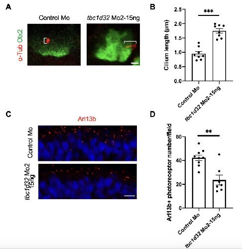 Supplemental Figure 10. Impact of Xenopus knockdown with tbc1d32 Mo2 on retinal ciliogenesis. A) Immunolabelling of acetylated -Tub and Otx2 showing a primary RPE cilium (delineated with brackets) on retinal sections of stage 35 embryos injected with a control Mo or with 15 ng of tbc1d32 Mo2. B) Scatter plot with bars showing the mean cilia length in RPE cells. Each dot corresponds to the mean length for one embryo. C) Immunolabelling of Arl13b showing the photoreceptor connective cilium on retinal sections of stage 35 embryos injected with a control Mo or with 15 ng of tbc1d32 Mo2. D) The scatter plot with bars shows the mean number of Arl13+ ciliated photoreceptors in one field of the central retina. Each dot corresponds to one embryo. All data are represented as mean SEM. **p<0.01, ***p<0.001; Mann and Whitney test. Scale bars = 2 m in A and 20 m in C. |