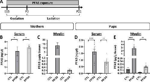 Fig. 1. . Accumulation of PFAS into pups myelin fraction. A) Flow chart of PFAS exposure (20 mg/L) of adult female mice via the drinking water from E15 of gestation and during the lactation period. At 3 weeks (p21), dams and pups were euthanized, brains dissected out and myelin bulk fraction purified on a Percoll gradient. B-E) At p21, PFAS were assayed by LC-MS/MS in the serum of dams and pups (B, D) and corresponding myelin fractions (C, E). Although similar levels of either PFOS or PFOA passed from the drinking water into the mother serum and from the mother milk into the pups serum, 133 time more PFOS was detected into the pups myelin fraction compared to PFOA. Note that low level of both PFOS and PFOA were detected into the myelin of control animals (E), which is explained by the presence of these PFAS into the normal drinking water given to control dams (see Supplementary Table 1).