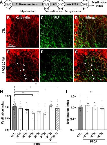 Fig. 3. . Ex vivo PFOS exposure inhibited remyelination. A) Flow chart showing the sequence of lysophosphatidylcholine-induced transient demyelination (from DIV6 to DIV7) of cerebellar slices followed by exposure to PFAS during the endogenous remyelination period, from DIV7 to DIV12. B-D) Cerebellar slices from p9 mice at 12 DIV doubly immunostained for calbindin (Purkinje cell bodies and axons in red in B, D, E, G) and PLP, (myelinated axons in green in C, D, F, G); note the decreased PLP + myelin staining in slices exposed to PFOS, while Purkinje cells and axons appeared unaffected (E) compared to controls (B); arrow head in E and G point to axons not ensheathed by myelin. (H, I) Dose response curve of either PFOS (H) or PFOA (I) exposure on the myelin index measured as a ratio between the calbindin (axon)and PLP (myelin) stainings. Note the non-monotonic dose response of PFOS and the reversal of PFOS inhibitory effect on remyelination by addition of T3 into the culture medium (hachured column in H). In contrast, PFOA (I) did not affect remyelination. Scale bar: B-G = 50 m. (For interpretation of the references to colour in this figure legend, the reader is referred to the web version of this article.)