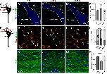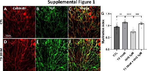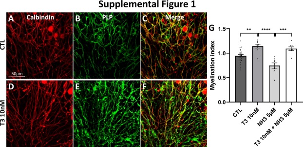 Remyelination is dependent on thyroid hormone signaling. Spontaneous remyelination of mouse cerebellar slices demyelinated by LPC is increased by addition of T3 (10nM) into the culture medium and inhibited by NH3 (5M) a thyroid hormone receptor antagonist. Purkinje cells and axons were immunostained with anti-calbindin (A, C, D, F) and myelin sheath with anti-PLP (B, E). G) Myelination index was evaluated in all 4 conditions
