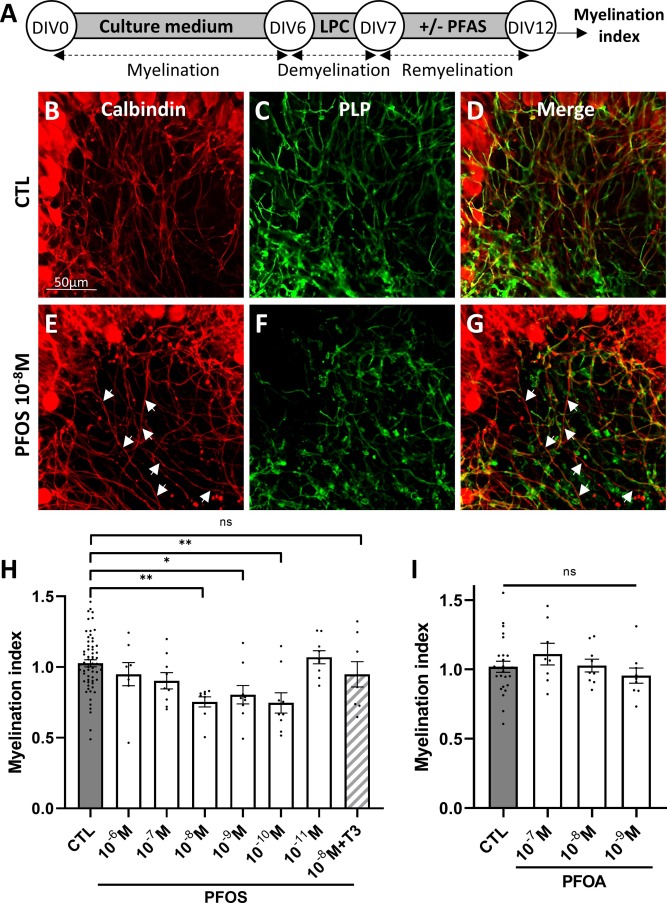 Fig. 3. . Ex vivo PFOS exposure inhibited remyelination. A) Flow chart showing the sequence of lysophosphatidylcholine-induced transient demyelination (from DIV6 to DIV7) of cerebellar slices followed by exposure to PFAS during the endogenous remyelination period, from DIV7 to DIV12. B-D) Cerebellar slices from p9 mice at 12 DIV doubly immunostained for calbindin (Purkinje cell bodies and axons in red in B, D, E, G) and PLP, (myelinated axons in green in C, D, F, G); note the decreased PLP + myelin staining in slices exposed to PFOS, while Purkinje cells and axons appeared unaffected (E) compared to controls (B); arrow head in E and G point to axons not ensheathed by myelin. (H, I) Dose response curve of either PFOS (H) or PFOA (I) exposure on the myelin index measured as a ratio between the calbindin (axon)and PLP (myelin) stainings. Note the non-monotonic dose response of PFOS and the reversal of PFOS inhibitory effect on remyelination by addition of T3 into the culture medium (hachured column in H). In contrast, PFOA (I) did not affect remyelination. Scale bar: B-G = 50 m. (For interpretation of the references to colour in this figure legend, the reader is referred to the web version of this article.)