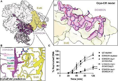 (B) AlphaFold prediction of the engagement interface between the DONSON globular dimerization domain and the Sld5 B-domain.