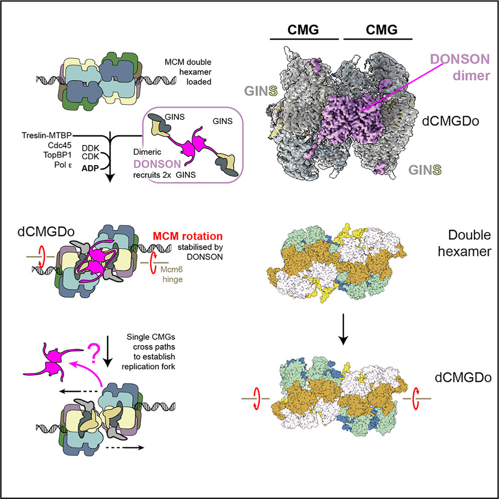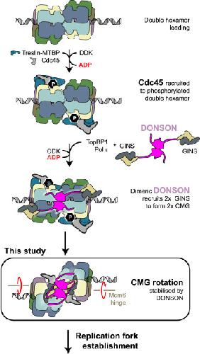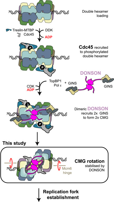 The phosphorylation is read by Treslin-MTBP, which in turn promote Cdc45 recruitment onto the MCM double hexamer. A DONSON dimer engages two copies of the GINS firing factors. It recruits them to the MCM double hexamer by engaging the Mcm3 ATPase via the D3 loop. The DONSON dimer then locks onto the double hexamer, delivering GINS to form the CMG. This leads to a reconfiguration in the double hexamer structure, with two MCM rings that rotate clockwise with respect to one another and become offset ready for replication fork establishment.