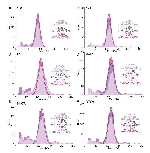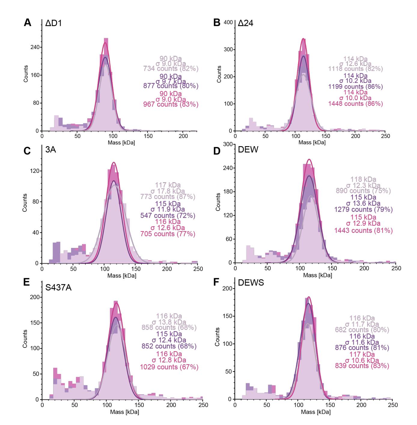 Asp374Ala, Glu377Ala, Trp381Ala (DEW). (E) Ser437Ala. (F) Asp374Ala, Glu377Ala,