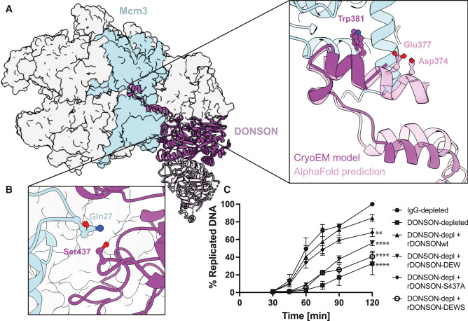 (A) One isolated CMG from the dCMGDo structure, engaged by dimeric DONSON. The zoomed in view shows the D3 loop of DONSON engaging the Mcm3 ATPase domain. The solid cartoon represents the atomic model built into the cryo-EM density. The transparent cartoon represents the AlphaFold prediction. The two models identify Trp381 as an Mcm3 ATPase interacting element. AlphaFold also identifies Asp374 and Glu 377 as ATPase-engaged.