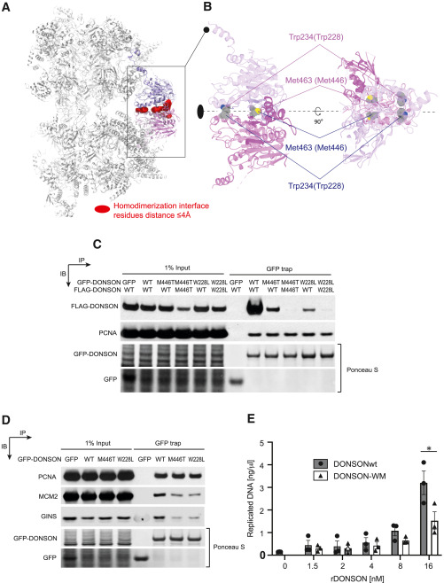 (C) The patient-associated DONSON Met446Thr and Trp228Leu mutations disrupt dimerization. Cells were transfected with different combinations of WT and mutant DONSON tagged with either GFP or FLAG (as indicated). GFP-DONSON was purified from cell extracts using GFP-Trap and co-purified proteins were subjected to SDS-PAGE and western blotting with the antibodies indicated. Ponceau S stain was used to visualize the affinity purified GFP-tagged DONSON on the nitrocellulose filter.