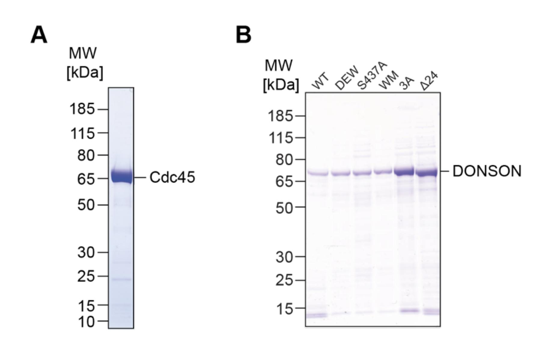 proteins resolved on SDS-PAGE gel and stained with Coomassie: (A) Xenla Cdc45-TEV-His10-