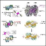 (B) The double hexamer to dCMGDo conversion viewed from an end-on view of the ATPase ring. The two MCM central channels are no longer co-axial in dCMGDo.