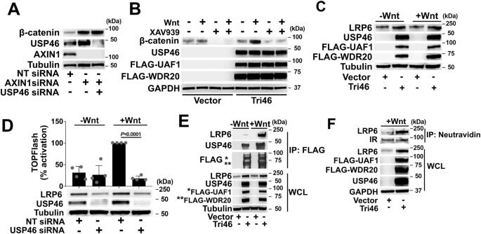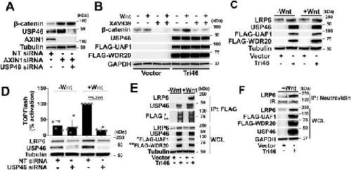 Fig. 3: The USP46 complex acts at the level of the Wnt receptor, LRP6. A, B USP46 is upstream of the β-catenin destruction complex. A USP46 depletion does not block the stabilization of β-catenin upon AXIN1 siRNA knockdown. HEK293 cells were transfected with USP46 and AXIN1 siRNAs as indicated and immunoblotted for β-catenin. Immunoblotting for AXIN1 and USP46 confirmed their knockdown. B The tankyrase inhibitor, XAV939, which stabilizes AXIN to promote β-catenin degradation, inhibits β-catenin stabilization mediated by the USP46 complex. Cells were transfected and treated with Wnt3a in the absence or presence of XAV939 (1 μM) as indicated and immunoblotted for β-catenin, USP46, FLAG-UAF1, and FLAG-WDR20. C, D Overexpression and knockdown of the USP46 complex increases and decreases steady-state levels of LRP6, respectively. Cells were transfected as indicated, incubated in the absence or presence of Wnt3a, and immunoblotted for LRP6. C HEK293 cells were transfected with the USP46 complex (Tri46) in the presence of Wnt3a. D HEK293 cells were transfected with non-targeting (NT) or USP46 siRNAs. Graph shows mean ± SD of TOPFlash normalized to non-targeting control in the presence of Wnt. p-values compare cells incubated with NT versus USP46 siRNA in the presence of Wnt3a. Significance was analyzed by two-tailed Student’s t-test. The graph shows a representative of n = 3 biologically independent experiments. E Wnt signaling promotes the association between the USP46 complex and endogenous LRP6. HEK293 cells were transfected with USP46 complex components and treated with Wnt3a as indicated, FLAG-UAF1 (*) and FLAG-WDR20 (**) immunoprecipitated (IP) with anti-FLAG conjugated beads, and co-immunoprecipitated LRP6 detected by immunoblotting. WCL whole cell lysates. F The USP46 complex increases cell-surface levels of LRP6. HEK293 cells were transfected with USP46 complex components and treated with Wnt3a, as indicated. Cells were then surface biotinylated, lysates subjected to neutravidin-pulldown, and immunoblotted for endogenous LRP6 and insulin (IR, control) receptors. WCL whole cell lysates. Tubulin and GAPDH are loading controls. All immunoblots are representative of at least three independent experiments. Source data are provided as a Source data file. |