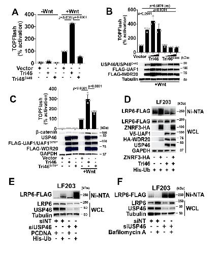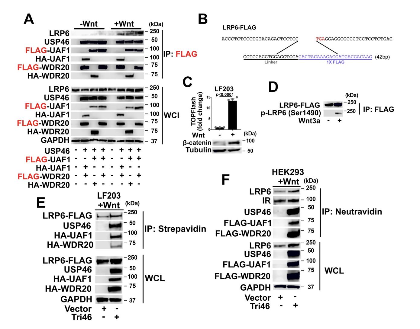 The USP46 complex deubiquitylates LRP6 to promote Wnt/β-catenin signaling.