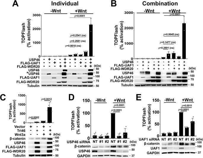 Fig. 1: The USP46 complex is a positive regulator of Wnt signaling. A–C Overexpression of the USP46 complex stimulates Wnt activation and stabilizes β-catenin levels. HEK293 STF cells were transfected and treated with recombinant Wnt3a (10 ng/ml) for 24 h as indicated. A Individual and B pairwise overexpression of USP46, FLAG-tagged WDR20, and FLAG-tagged UAF1 in HEK293 STF cells in the presence of Wnt3a leads to lower Wnt reporter (TOPFlash) activity compared to overexpression of all three members. The asterisk in (A) indicates a longer exposure for the USP46 blot. C Overexpression of the USP46 complex (Tri46) in HEK293 STF cells potentiates Wnt3a-mediated TOPFlash and promotes β-catenin stabilization. For transfections, the amount of total DNA was kept constant by the addition of vector plasmid. p values compare vector-transfected with USP46 complex-transfected cells. Tubulin is loading control. D, E Knockdown of USP46 and UAF1 by siRNA inhibits Wnt signaling and decreases β-catenin levels. HEK293 STF cells were transfected with non-targeting control (NT) or two independent (D) USP46 or (E) UAF1 siRNAs and treated with recombinant Wnt3a. Immunoblotting confirmed the knockdown of USP46 and UAF1 proteins. GAPDH is loading control. All graphs show mean ± SD of TOPFlash normalized to vector control in the presence of Wnt. p values compare NT treated to USP46 or UAF1 siRNA-treated cells. p ≥ 0.05 is not significant (ns). Significance was analyzed by one-way ANOVA followed by Tukey’s multiple comparisons test. Graphs all show a representative of n = 3 biologically independent experiments. All immunoblots are representative of at least three independent experiments. Source data are provided as a Source data file. |