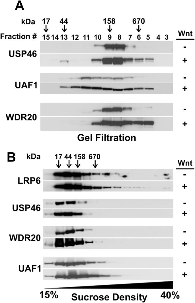 Fig. 4: The USP46 complex associates with large complexes independent of LRP6 signalosomes in the presence of Wnt. A Wnt signaling induces the formation of high molecular weight USP46 complexes as assessed by size exclusion chromatography. HEK293 cells were treated in the absence or presence of Wnt3a, lysates prepared, and high-speed (100,000 × g) supernatants passed over a Superdex 200 FPLC column. Fractions obtained were subjected to TCA precipitation followed by immunoblotting. B The USP46 complex does not co-fractionate with high molecular weight LRP6 aggregates (signalosomes) on sucrose gradient centrifugation. HEK293 cells were incubated in the absence or presence of Wnt3a, Triton X-100 lysates were collected, and sucrose density gradient (15–40%) sedimentation was performed. Fractions were precipitated with chloroform-methanol extraction and analyzed by immunoblotting. The predicted kDa is based on the elution profile of a set of protein standards. Immunoblots show a representative of three independent experiments. Source data are provided as a Source data file. |