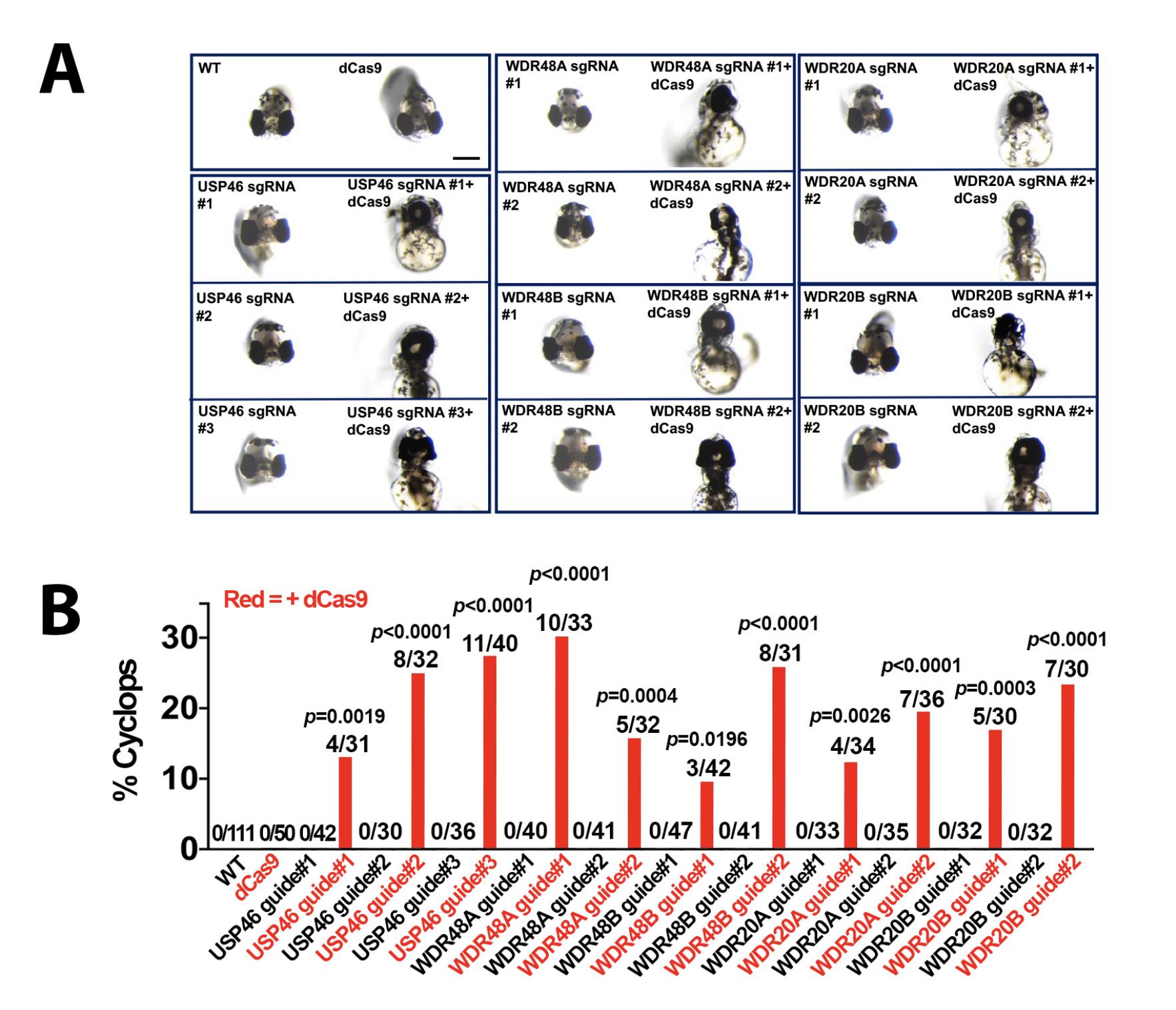 Supplementary Figure 2. CRISPRi of USP46 complex in zebrafish induces a cyclopic phenotype. (A) Representative images are shown on top. Scale bar = 200 mm. (B) The percentage of cyclopic embryos is graphed with absolute numbers indicated on the top of each bar. Graphs show mean ± SEM. p-values compare guide RNA plus dCas9-injected embryos versus WT. Significance was assessed using 2-sided Fisher’s exact test. n = 3 independent pools of embryos. Comparisons between Wildtype (WT) versus dCas9, WT versus guide RNA alone, and dCas9 versus guide RNA alone were not statistically significant. Source data are provided as a Source Data file. |