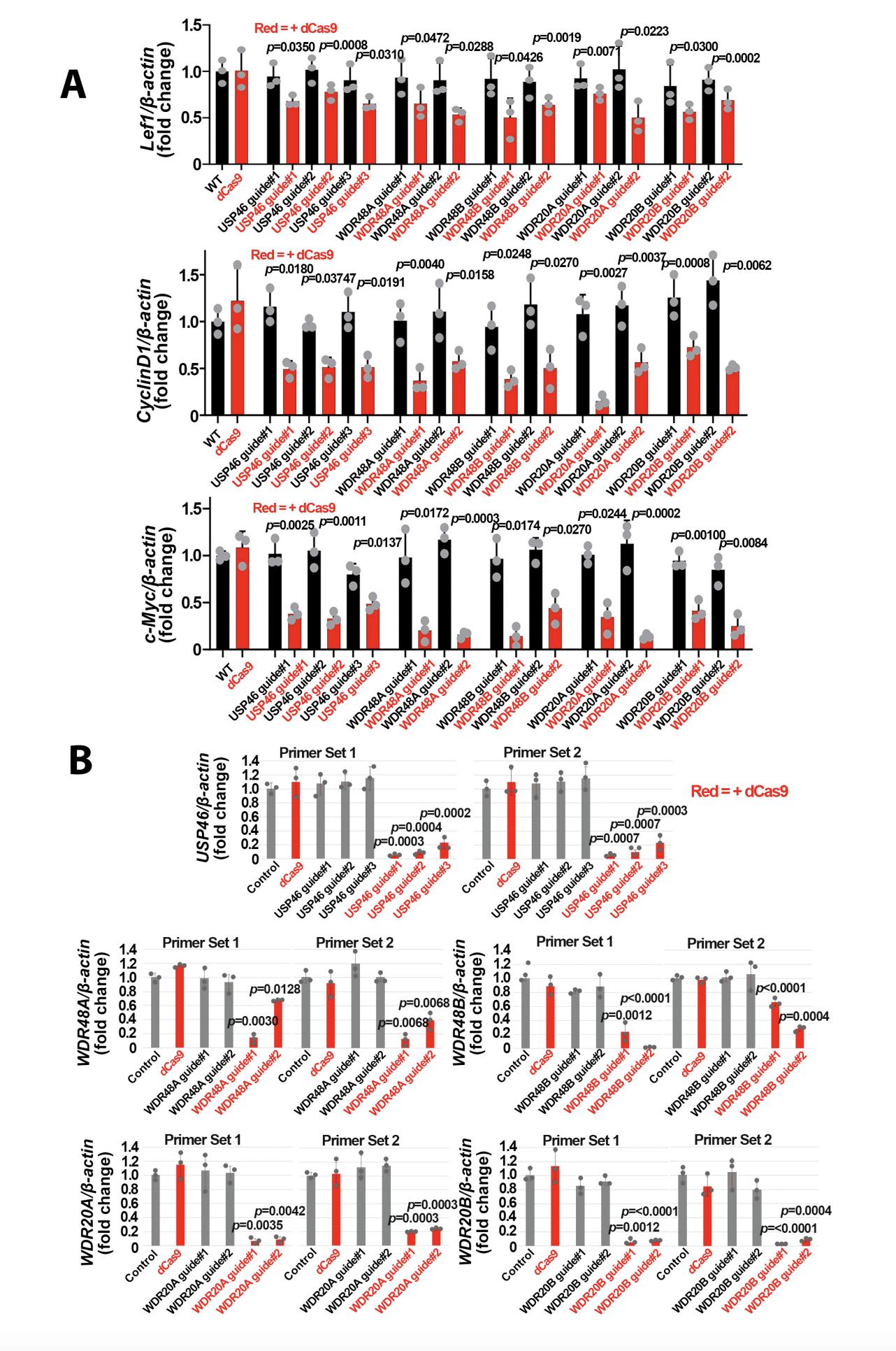 Supplementary Figure 3. CRISPRi of USP46 complex in zebrafish result in a reduction of Wnt target gene transcripts. (A) mRNAs were isolated from injected single embryos, and Lef1, CyclinD1, and c-Myc levels were quantified by RTPCR. (B) qRT-PCR confirms significant reductions in mRNA levels of USP46 components in their respective guide RNA plus dCas9-injected embryos. Two primer sets were used for each gene. Gene expression is graphed as a ratio to b-actin control. p-values compare guide RNA-injected versus guide RNA plus dCas9-injected embryos. Graphs show mean ± SEM. Significance was analyzed by two-tailed Student’s t-test. Comparisons between Wildtype (WT) control versus dCas9, WT versus guide RNA alone, and dCas9 versus guide RNA alone were not statistically significant. Source data are provided as a Source Data file. |