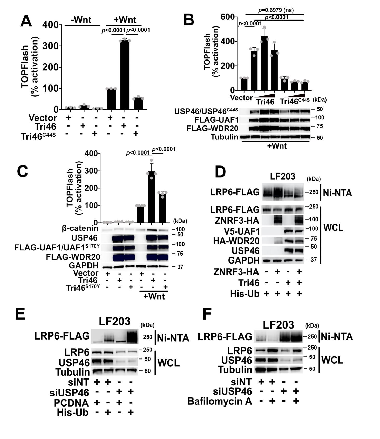 Supplementary Figure 6. The deubiquitylase activity of the USP46 complex is required for its regulation of the Wnt pathway. (A-C) HEK293 STF cells were transfected and treated with recombinant Wnt3a (10 ng/ml) for 24 hr as indicated. Lysates were then prepared for TOPFlash and immunoblotting. (A) Overexpression of catalytically dead USP46C44S fails to potentiate Wnt signaling as assessed by Wnt reporter assay. p-values compare USP46 complex (Tri46) and USP46C44S complex (Tri46C44S) transfected cells in the presence of Wnt3a. (B) Titration of increasing amounts of catalytically dead USP46C44S fails to potentiate Wnt signaling as assessed by Wnt reporter assay. p-values compare 1) cells transfected with vector with cells transfected with the lowest amount of USP46 and 2) cells transfected with the lowest amount of USP46 and cells transfected with the highest amount of USP46C44S. ns compares vectortransfected cells with the highest amount of USP46C44S complex-transfected cells. p≥0.05 is not significant (ns). (C) The USP46/UAF1S170Y/WDR20 (Tri46S170Y) complex exhibits reduced activity. p-values compare 1) Wnt3a-treated cells transfected with wild-type UAF1 USP46 complex (Tri46) or catalytically dead UAF1S170Y USP46 complex (Tri46S170Y) and 2) Wnt3a-treated cells transfected with vector or Tri46 complex. All graphs show mean ±SD of TOPFlash normalized to vector transfected, Wnt3a-treated control. Significance was analyzed by one-way ANOVA followed by Tukey’s multiple comparisons test. (D-F) His-ubiquitylation assays. LF203 cells were transfected as indicated, lysed under denaturing conditions, and His-Ub modified proteins isolated by nickel affinity purification. LRP6 and FLAG-tagged proteins were detected by immunoblotting with anti-LRP6 and anti-Flag antibodies, respectively. WCL = whole cell lysates. (D) Overexpression of ZNRF3 in LF203 cells promotes LRP6 ubiquitylation, which is opposed by overexpression of the USP46 complex. (E) Detection of ubiquitylated LRP6 with the Hisubiquitylation assay is specific to cells transfected with His-Ub. PCNDA is transfection control. (F) Treatment with Bafilomycin A blocks LRP6 turnover upon USP46 knockdown. Cells were transfected as indicated and treated with DMSO or Bafilomycin A (10 nM) overnight prior to the His-ubiquitylation assay. Graphs show representatives of n = 3 independent experiments performed in triplicates. Immunoblots are representative of at least three independent experiments. Source data are provided as a Source Data file. |