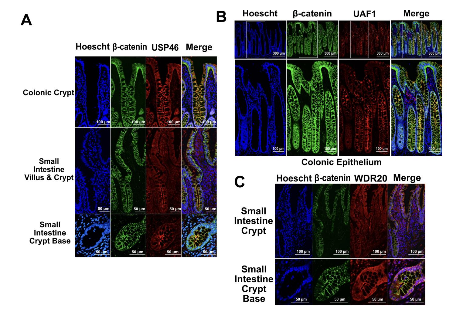 Supplementary Figure 8. Membranous USP46 and UAF1 are concentrated in the crypts, while WDR20 is uniform in the intestine. (A-C) Multiplex immunofluorescence of USP46, UAF1, and WDR20 FFPE human tissue blocks of human small intestine and colon. (A) USP46 immunostaining increases in intensity toward the base of the intestinal crypts. (B) UAF1 is present in the epithelium of intestinal crypts. (C) WDR20 is uniformly expressed in the human small intestine and colon. Hoescht stains the nucleus. n=3 independent experiments. Source data are provided as a Source Data file. |