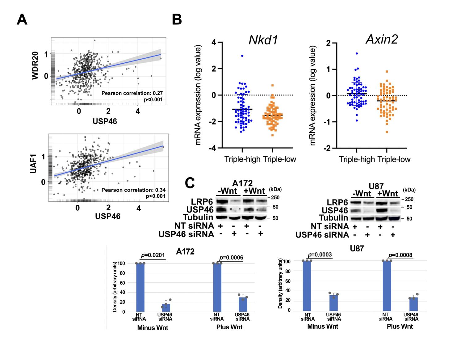 Supplementary Figure 10. Elevated USP46 complex levels are associated with increased Wnt activity in glioblastoma. (A) USP46 positively correlates with the expression of UAF1 and WDR20 in glioblastoma (TCGA-GBM Agilent platform). Correlation analysis between indicated genes (Top, USP46, and WDR20 and Bottom, USP46, and UAF1) was performed using the TCGA-GBM mRNA expression data from the Agilent-4502A platform (http://gliovis.bioinfo.cnio.es/). Pearson correlation coefficient and p-value were calculated and indicated in each panel. (B) mRNA expression levels of Wnt target genes, Nkd1 (p-value = 0.0057) and Axin2 (p-value = 0.0010), in the USP46-high/UAF1-high/WDR20-high group (triple-high) and the USP46-low/UAF1-low/WDR20-low group (triplelow) groups. (C) USP46 is required for the stabilization of LRP6 in glioblastoma cell lines. siRNA knockdown of USP46 decreased steady-state levels of LRP6 in A172 and U87 glioblastoma cell lines. LRP6 levels were quantified and normalized to the NT control. Graph shows mean ± SEM of three independent replicates. p-values (two-tailed Student’s t-test) versus NT control. Immunoblots are representative of three independent experiments. Source data are provided as a Source Data file |