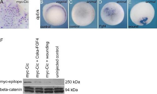 A, Immunohistochemistry showing myc-tagged murine CIC-S expressed from injected synthetic mRNA (500 pg) localises to the nuclei of cells in the animal pole region of a Xenopus laevis embryo at gastrula stage 10.5. B, vegetal view of immunohistochemistry for activated diphospho Erk (dpErk) showing the staining in the nascent mesoderm around the blastopore in control embryos at gastrula stage 10.5. Staining is restricted to a known region of Fgf signalling. C, no dpErk is detected in the animal pole region of control embryos. D, localised injection of 10 pg Cska-Fgf plasmid or E, needle puncture wounding of the presumptive ectoderm results in ectopic Erk activation in cells of the animal hemisphere. F, Western blot showing that Cska-Fgf4 injection or puncture wounding reduces the levels of myc-Cic protein relative to control myc-Cic expressing gastrula stage 10.5 embryos. Embryos were collected 30 minutes after wounding. beta-Catenin is a loading control.