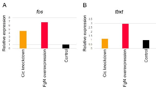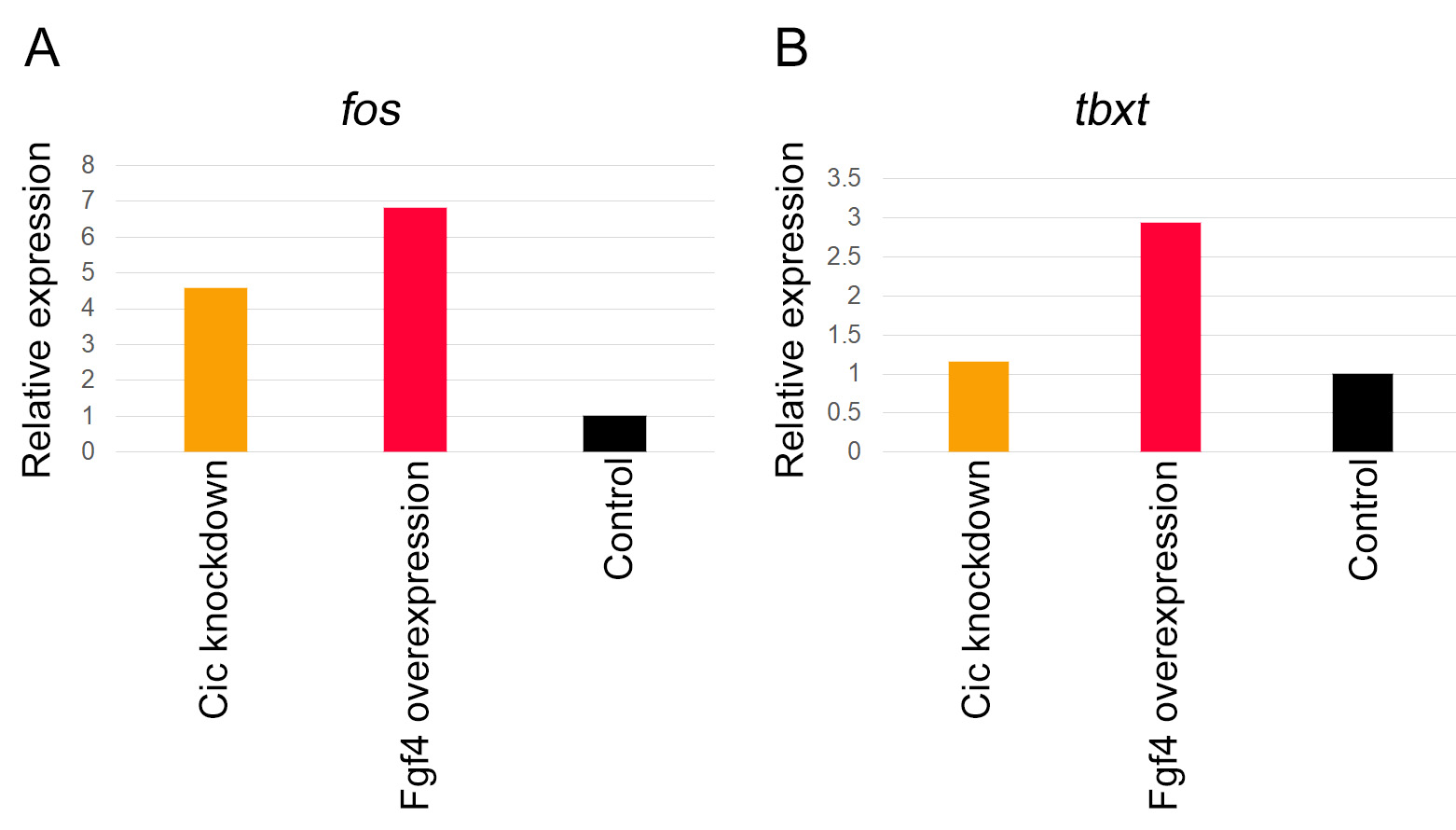 A and B, qPCR analysis of fos and tbxt mRNA expression in Fgf4 overexpressing, Cic knockdown and control water injected embryos at neurula stage 14. Values are normalised to dicer mRNA expression and shown relative to expression in control embryos.