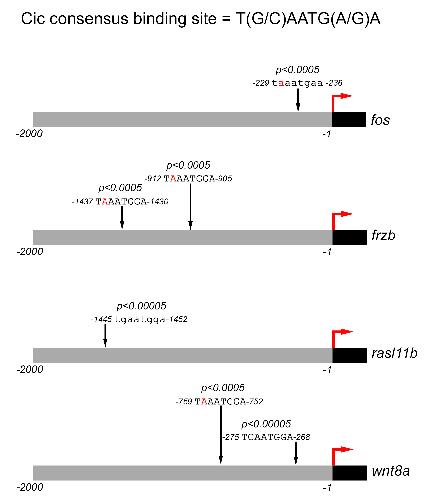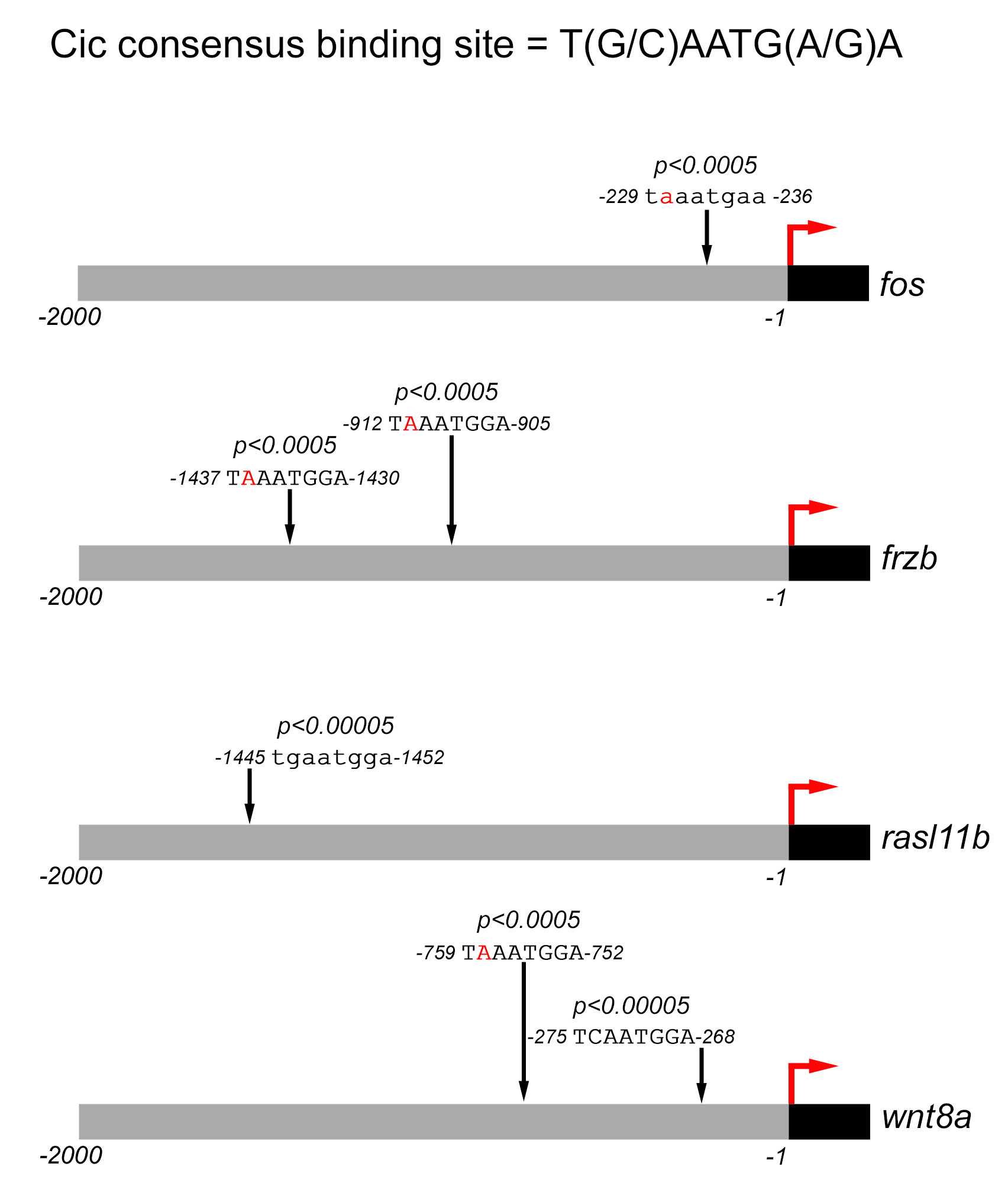 Position, orientation and statistical significance of Cic consensus binding sites in the 2kb upstream regions of putative targets of Cic regulation in Xenopus, identified by scanning with the FIMO tool from the MEME suite. Lower-case and upper-case sites are on the plus and minus strands, respectively.