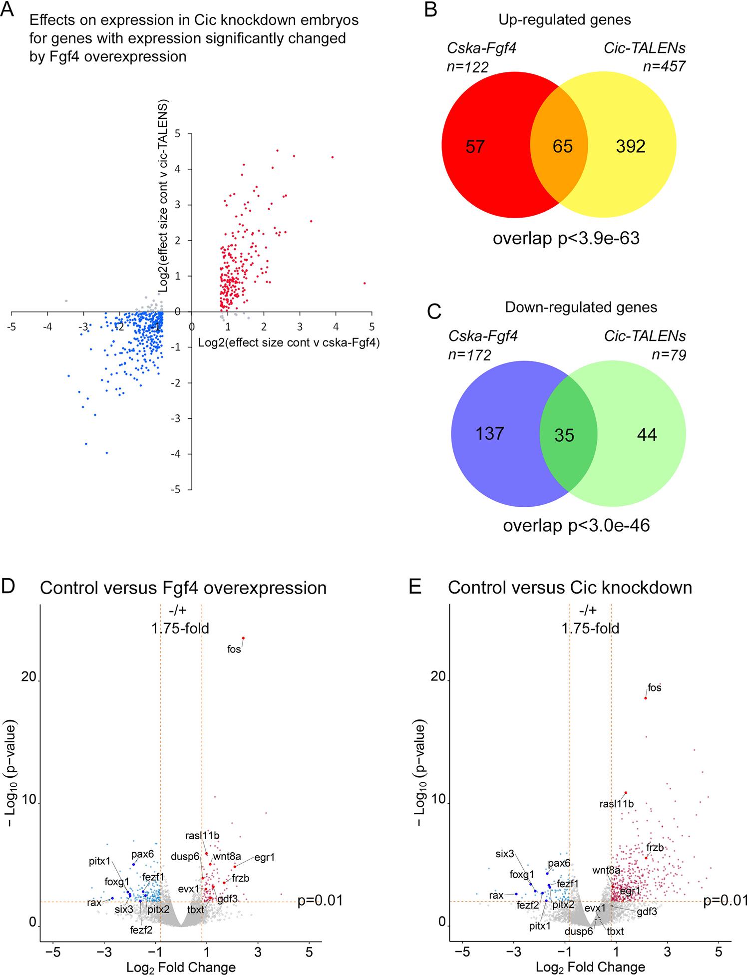 A, Scatterplot of changes in gene expression (log2 effect size) at early neurula stage 14 following injection of 1 ng each of forward and reverse Cic-TALENs versus log2 effect size in genes significantly changing in embryos injected with of 5 pg Cska-Fgf4 plasmid (p≤ 0.01, effect size ≥1.75 or ≤0.571). Red and blue dots, respectively, indicate congruent up and down regulation. B and C, Venn diagrams of genes in Xenopus tropicalis embryos at early neurula stage 14 significantly up-regulated (p≤0.01, effect size ≥1.75) or down-regulated (p≤0.01, effect size ≤0.571) in Fgf4 overexpressing (Cska-Fgf4 injected) or Cic knockdown (Cic-TALEN injected) embryos, p-values of overlaps are indicated. D and E, Volcano plots of gene expression in control water injected embryos versus Fgf4 overexpressing embryos and control versus Cic knockdown embryos. Significantly up-regulated genes are indicated in red and down-regulated genes in blue. Grey points indicate genes below the significance thresholds.