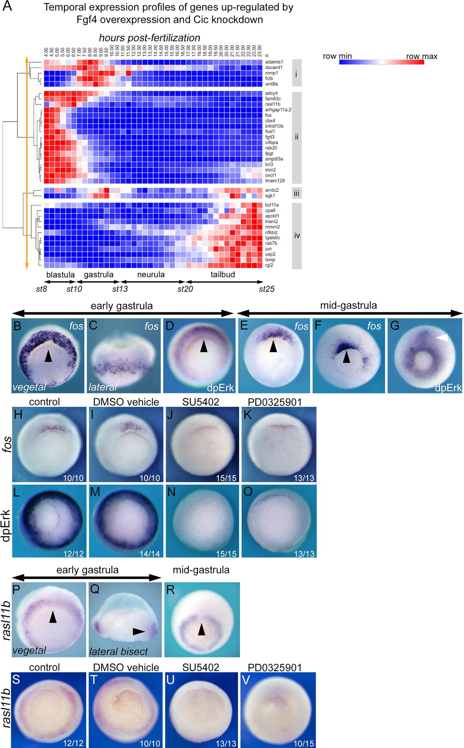A, Cluster analysis of the temporal expression patterns (4 to 23 hours post-fertilisation at 24°C) of genes up-regulated by both Fgf4 overexpression and Cic knockdown. Red shading indicates increased and blue shading decreased expression relative to the average expression level (white). Clusters i to iv are indicated. Orange arrow indicates the level at which the clustering tree was cut. B, C, E and F, are in situ hybridizations showing fos mRNA expression in early (stage 10+) and mid-gastrula (stage 10.5 and stage 11.5) Xenopus tropicalis embryos. D and G show immunohistochemical staining for dpErk in early (stage 10+) and mid-gastrula (stage11.5) embryos. Gastrula stage 10.5 embryos showing fos mRNA expression, H-K, or dpErk staining, L-O, in control embryos and embryos treated from stage 8 with 0.2% DMSO drug vehicle, 200μM SU5402 Fgfr inhibitor or 25 μM PD0325901 Mek inhibitor. P-R are in situ hybridizations showing rasl11b expression in early (stage 10+) and mid-gastrula (stage 11.5) embryos. Q is lateral view of a bisected embryo. S-V rasl11b expression in control embryos and embryos treated from stage 8 with 0.2% DMSO drug vehicle, 200μM SU5402 Fgfr inhibitor or 25 μM PD0325901 Mek inhibitor. All views are vegetal with dorsal to the top unless indicated. Black arrows indicate the dorsal blastopore lip. White arrow indicates involuted dorsal mesoderm. NB Indicated n values are from a representative experiment.