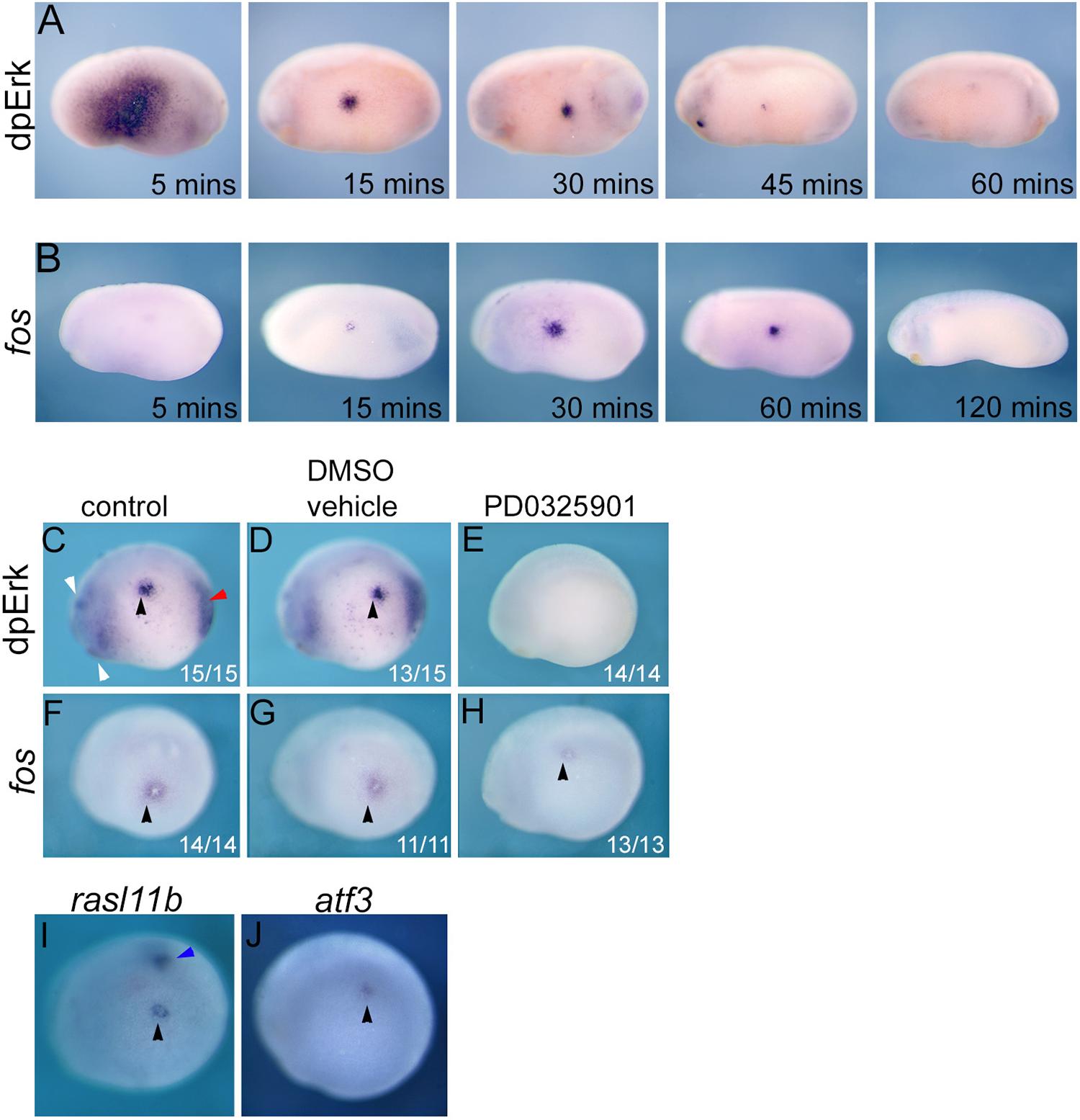 A, time course (5 to 60 minutes) of dpErk expression following ectodermal puncture wounding on the flank of Xenopus laevis tailbud stage embryos. B, time course (5 to 120 minutes) of fos mRNA expression following wounding of Xenopus laevis tailbud stage 20 embryos. dpERK, C-E, and fos, F-G, expression at 30 minutes post-wounding in Xenopus tropicalis control embryos and embryos pre-treated with 0.1% DMSO drug vehicle or Mek inhibitor PD0325901 (25 μM in 0.1% DMSO) from neurula stage 14. I, activation of rasl11b expression at 10 minutes post-wounding. J, activation of atf3 expression at 90 minutes post-wounding. Black arrow indicates site of wounding. White and red arrows indicate domains of dpErk corresponding to known regions of Fgf signalling in the anterior nervous system and posterior mesoderm, respectively. Blue arrow indicates endogenous rasl11b expression in the presomitic mesoderm. All are lateral views with anterior to the left and dorsal to the top. NB Indicated n values are from a representative experiment.