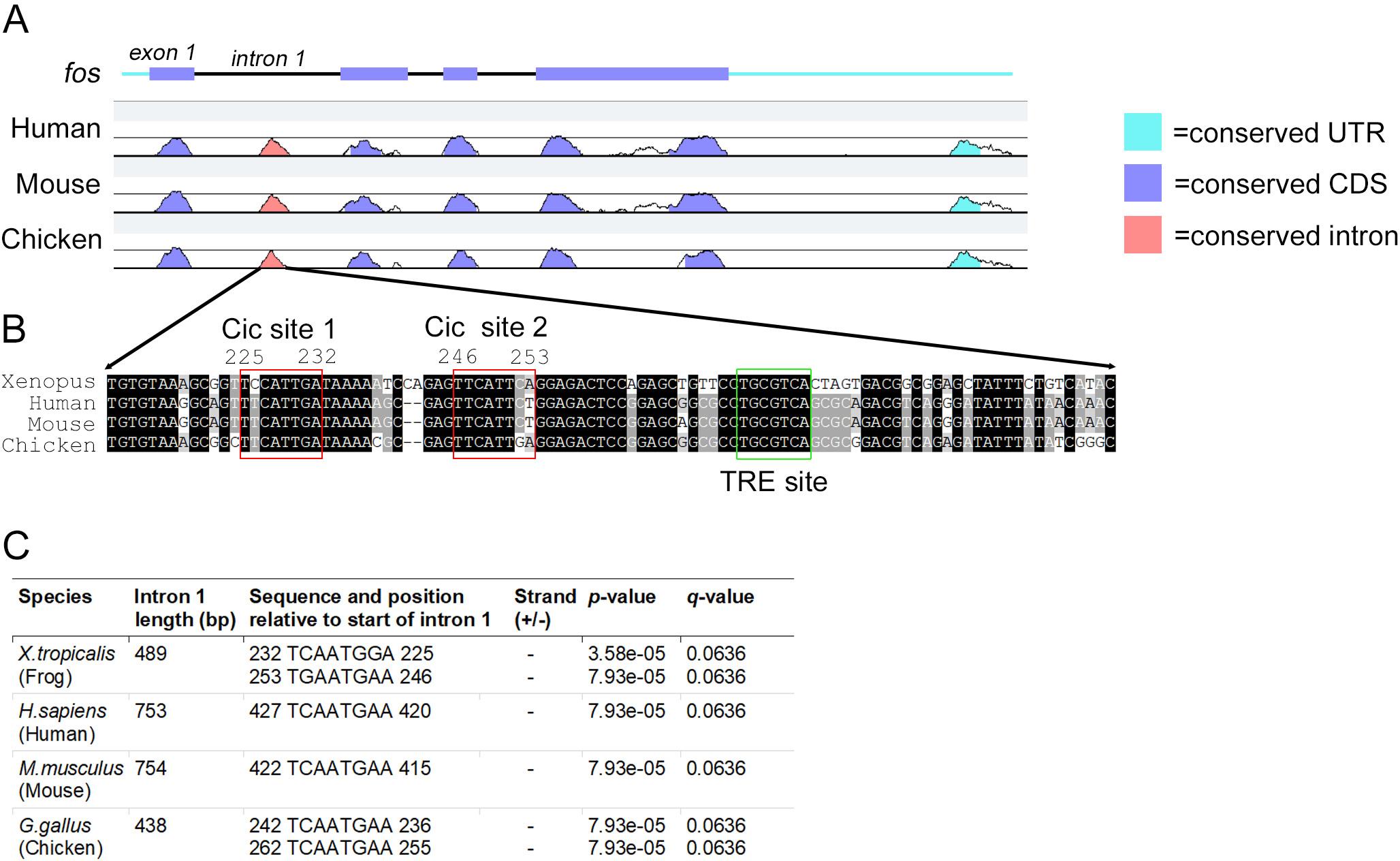 Fig 6. Conserved Cic binding sites are present in intron 1 of fos.