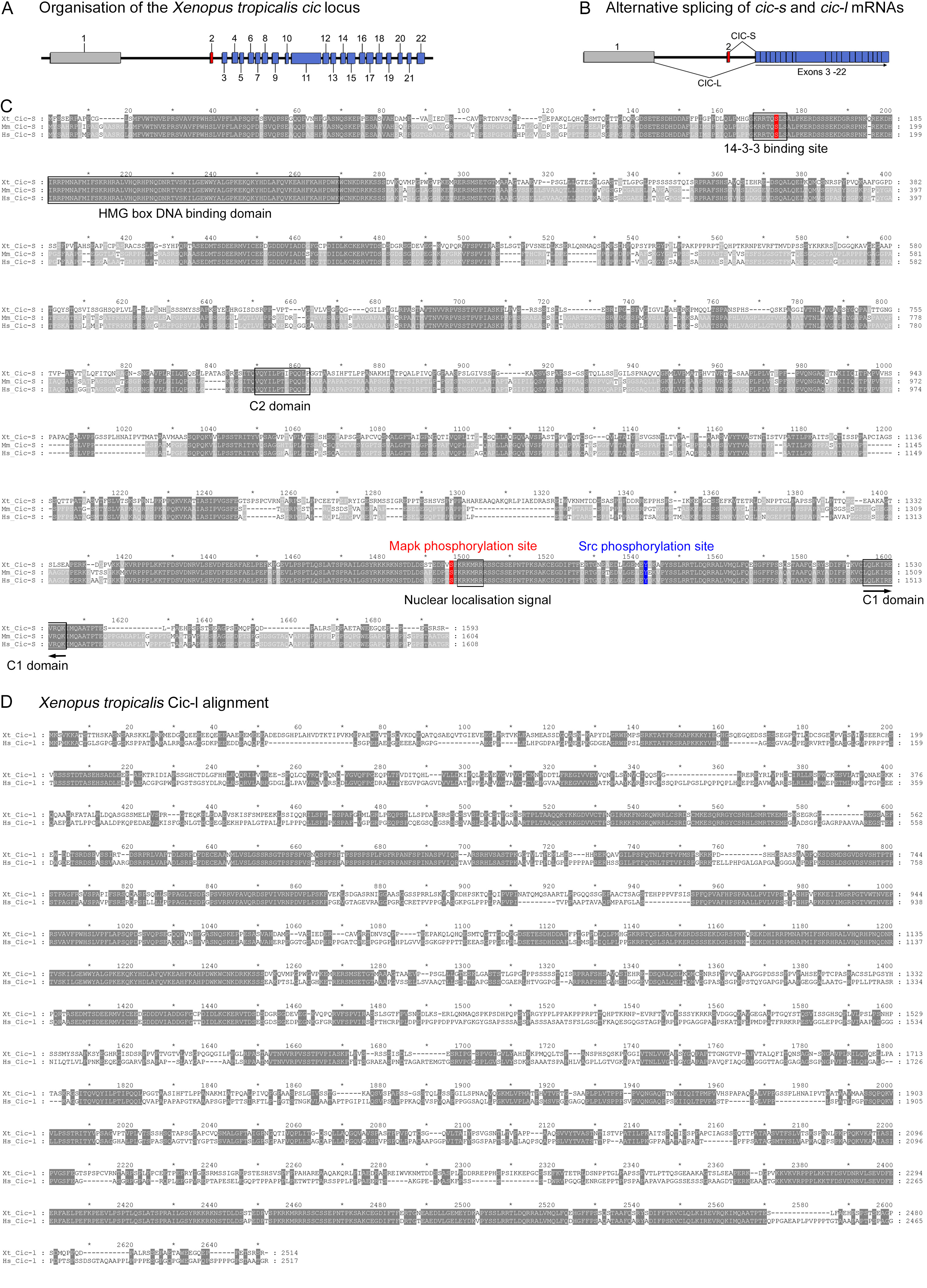 A, diagram of the exon/intron structure of the Xenopus cic locus. B, diagram showing how alternative splicing of exons 1 and 2 give rise two Cic isoforms with different N-termini. C, Conceptual Xenopus Cic-s peptide sequence aligned with Cic-s from human and mouse. The conserved HMG box DNA binding domain, potential monopartite nuclear localisation signal, C1 repression domain, C2 Mapk docking domain, Mapk and Src phosphorylation sites are indicated. D, peptide sequence alignment of Xenopus and human Cic-l.