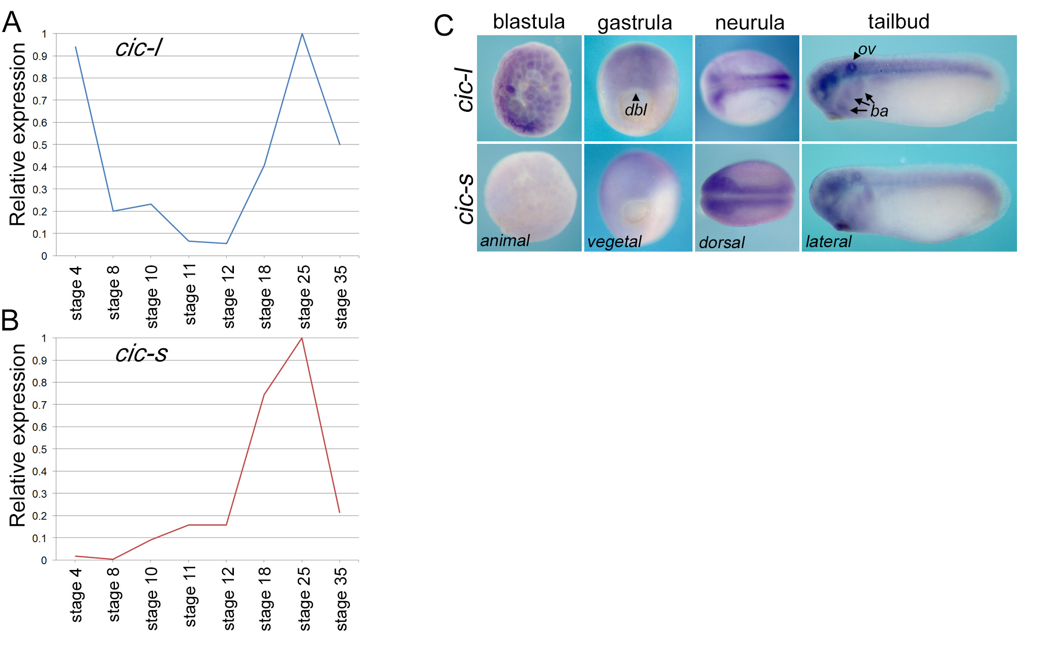 A and B, qPCR analysis of cic-l and cic-s. Expression is normalised to ubiquitously expressed control dicer and shown as relative to maximum expression level. C, in situ hybridisation analysis using isoform specific antisense probes to cic-s and cic-l. Embryo orientations are indicated. dbl = dorsal blastopore lip, ov = otic vesicle and ba = branchial arches.