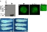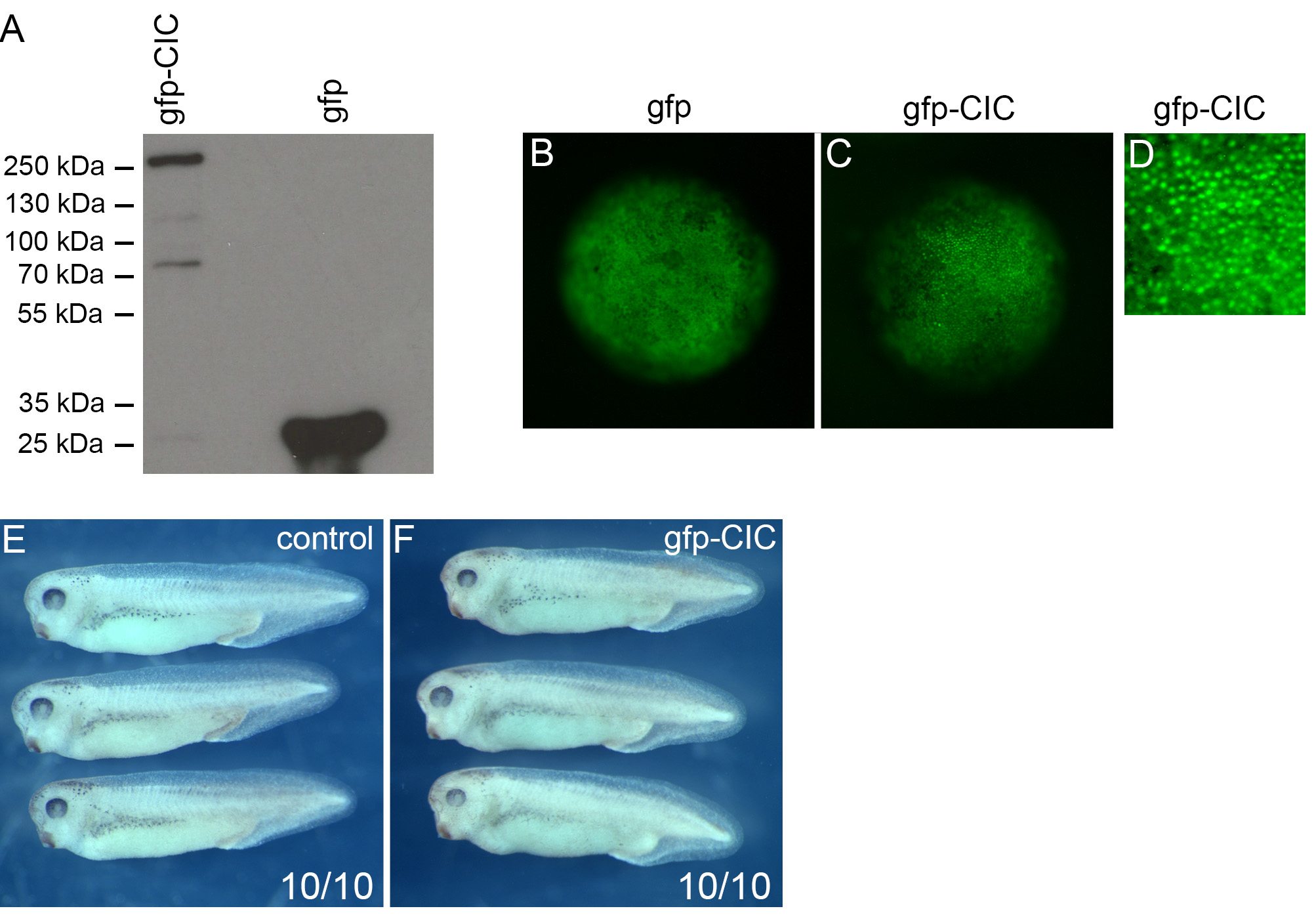 A, is a western blot detecting gfp (~27 kDa) and gfp-tagged human CIC (~250 kDa) proteins translated in gastrula stage embryos from injected mRNAs (image is uncropped). B, shows fluorescence of cytoplasmic gfp protein in the animal hemisphere of a gastrula stage embryo. C and D (higher magnification), show strong nuclear expression of gfp-CIC. E, phenotype at larval stage 37 of uninjected control embryos and F, embryos injected with 6ng synthetic gfp-CIC mRNA. NB Indicated n values are from a representative experiment.