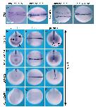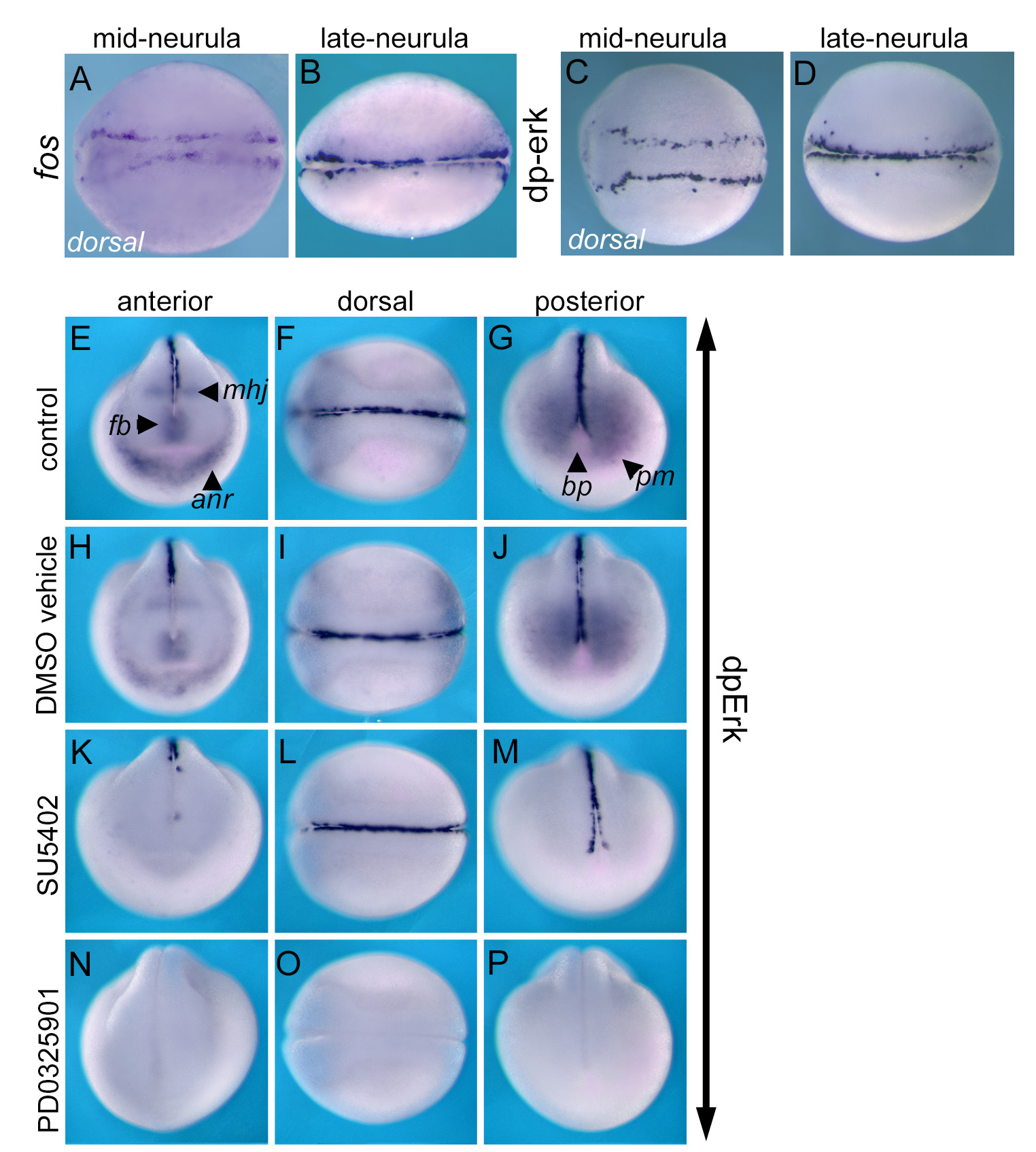 Dorsal views of neurula stage embryos showing localisation of fos mRNA by in situ hybridisation, A and B, and dpErk by immunohistochemistry, C and D. E-P, immunolocalisation of dpErk in untreated control embryos and embryos treated with 0.1% DMSO vehicle, 200 μM Fgfr inhibitor SU5402 or 25 μM Mek inhibitor PD0325901. anr = anterior neural ridge, bp = blastopore, fb = forebrain, mhj = midbrain/hindbrain border, pm = posterior mesoderm. NB Indicated n values are from a representative experiment.