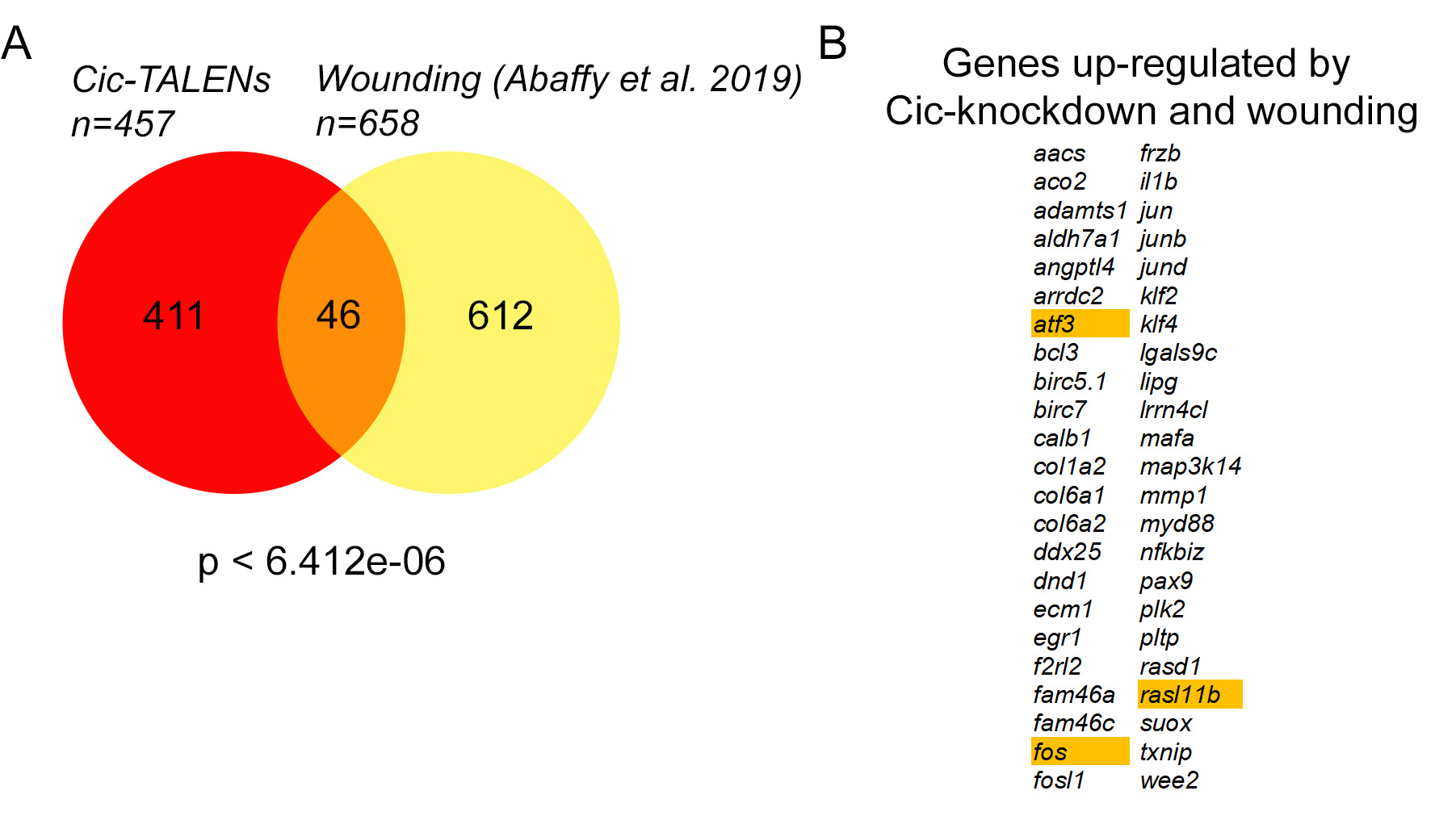 Xenopus laevis wounding datasets from [50] were filtered to only include genes annotated in the Xenopus tropicalis genome (12992 genes). Datasets for 30–90 minutes post-wounding were combined and filtered according to the following criteria, fold up-regulation ≥1.75 and p-adj ≤0.1. Duplicate gene entries were removed from the Xenopus laevis dataset. A, shows the highly significant overlap of genes up-regulated by Cic-knockdown in Xenopus tropicalis and wounding in Xenopus laevis. B, Genes up-regulated by Cic-knockdown and ectodermal wounding. Orange shading indicates genes analysed at the site of wounding in this study (Fig 5).