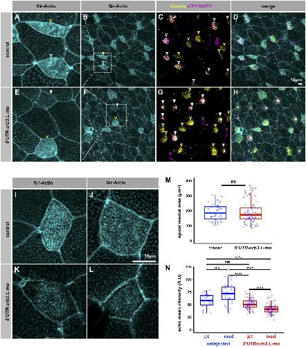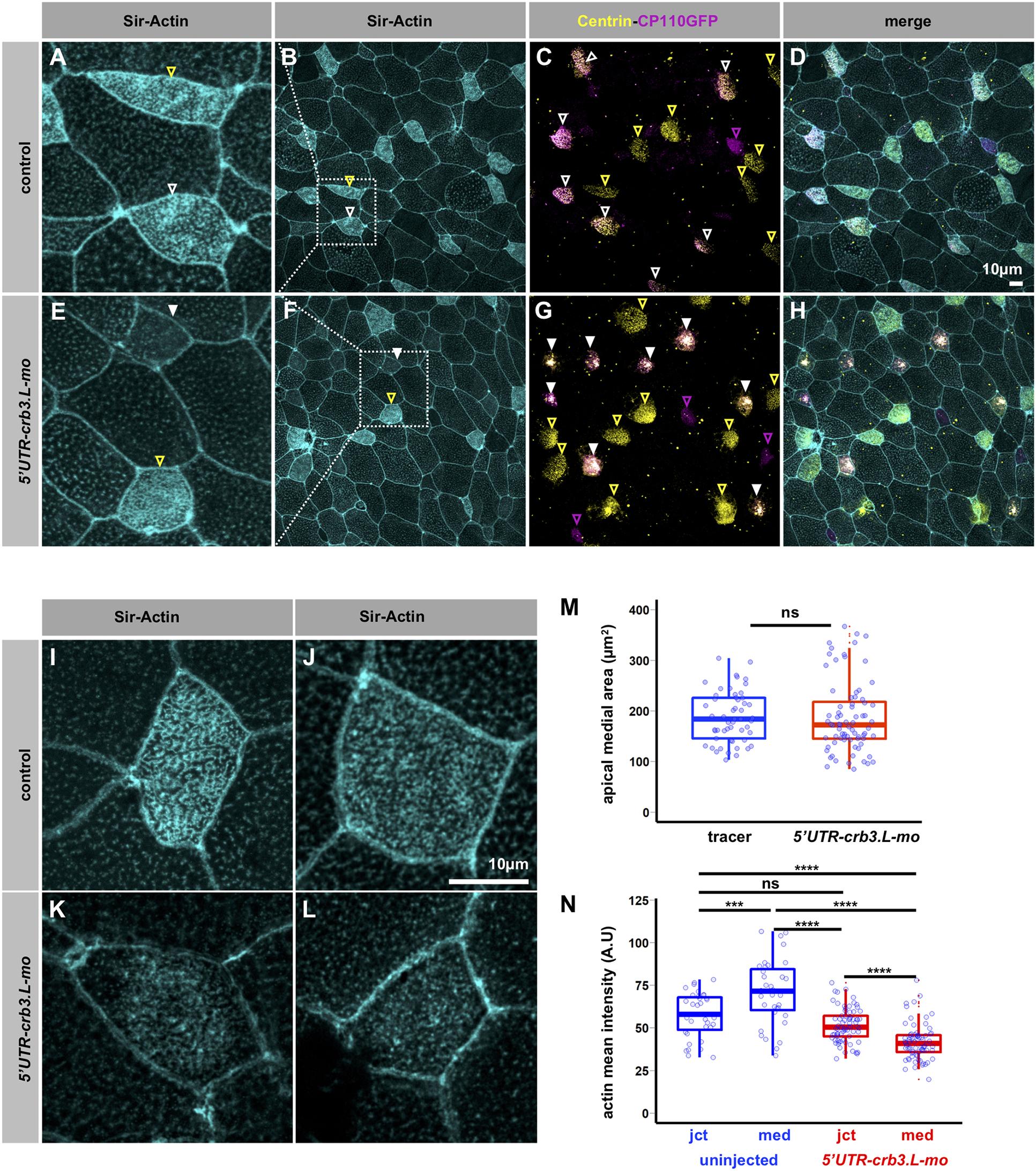 Fig. 4. Crb3.L is required for proper organization of the actin cytoskeleton in MCCs. (A–H) Maximum intensity projection of whole-mount stage 28 embryos, actin is stained with the Sir-actin probe, BBs are detected with anti-Centrin antibodies, cp110-GFP mRNA is a tracer labeling BBs in injected cells. (A–D) Mosaic control injected with cp110-GFP mRNA, (I–H) mosaic morphants co-injected with 5′UTR-crb3L-mo and cp110-GFP mRNA. (C,G) Noninjected MCCs are detected via Centrin endogenous staining displayed in the yellow channel in both mosaic controls and morphants (arrowheads outlined in yellow). Non-MCCs cells are labeled with Cp110-gfp displayed in the magenta channel (arrowheads outlined in magenta). Injected MCCs are revealed by doubly labeled BBs (endogenous Centrin-postive injected cp110-GFP tracer) and thus appear in an orange–pink to white range of color. Arrowheads with white outlines point to control tracer injected MCCs. White filled arrowheads point to 5′UTR-crb3L-mo- plus cp110-GFP tracer-injected MCCs. BB intracytoplasmic aggregation results in a bright orange–pink to white signal (white filled arrow). (A–E) Crop image of the ROI delineated by the white dashed square in B and F. (I–L) Higher magnification of the actin meshwork in control and morphant MCCs. (M) Measurements of apical medial area in control tracer-injected embryos (tracer) and 5′UTR-crb3.L morphants (5′UTR-crb3.L-mo). The apical medial area delimited by the apical cell–cell junction is used as a proxy for the apical cell surface. (N) Quantification of the actin cytoskeleton defect. Junctional (jct) and medial (med) actin mean intensity are measured in the MCCs of mosaic 5′UTR-crb3.L morphants. Absence of variation in junctional actin intensity between noninjected and 5′UTR-crb3.L injected MCCs enables interpretation of variation of medial actin intensity. Mean actin intensity is presented in arbitrary units (A.U). Results are presented as Tukey box plots. Pictures and graphs from one representative experiment out of three experiments (mosaic morphants embryos, n=7; noninjected cells, n=35; morpholino-injected cells, n=72). ***P<0.005, ****P<0.001; ns, not significant (M, Wilcoxon test; N, Kruskal–Wallis test with post hoc Wilcoxon test with Bonferroni correction). |