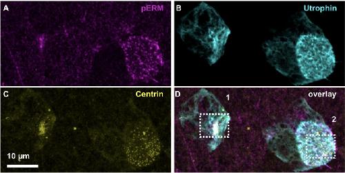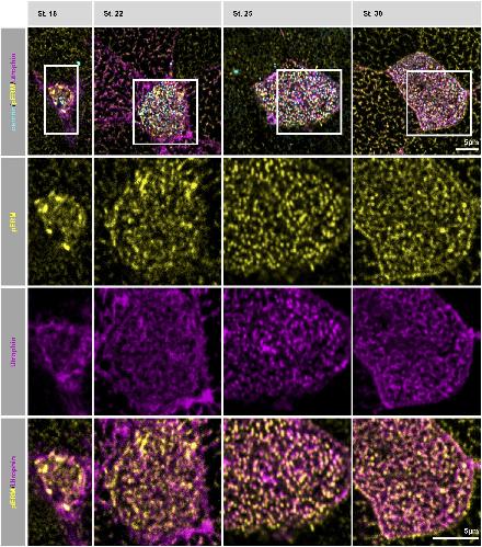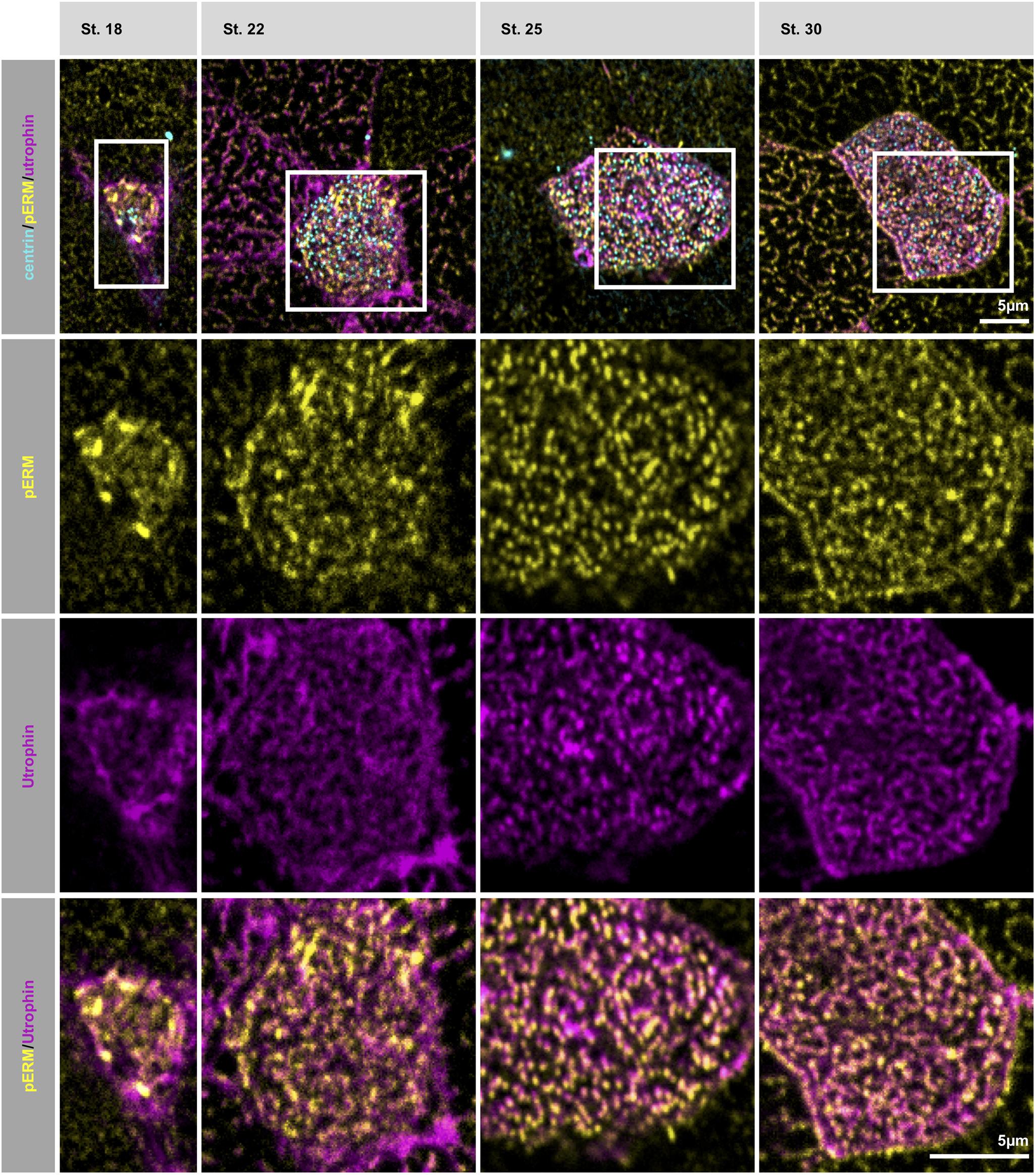 Fig. 5. Endogenous pERM expression in MCCs. Single confocal section of whole-mount embryos between stage (St.) 18 and 30, focusing on the emerging and maturing apical domain of MCCs. pERM detection is coupled Utrophin-GFP to label actin. BBs are detected with anti-Centrin antibodies. ROIs are shown by white squares in the first row, cropped magnified pictures corresponding to these ROIs are presented in the following rows. Images are representative of more than three repeats. |