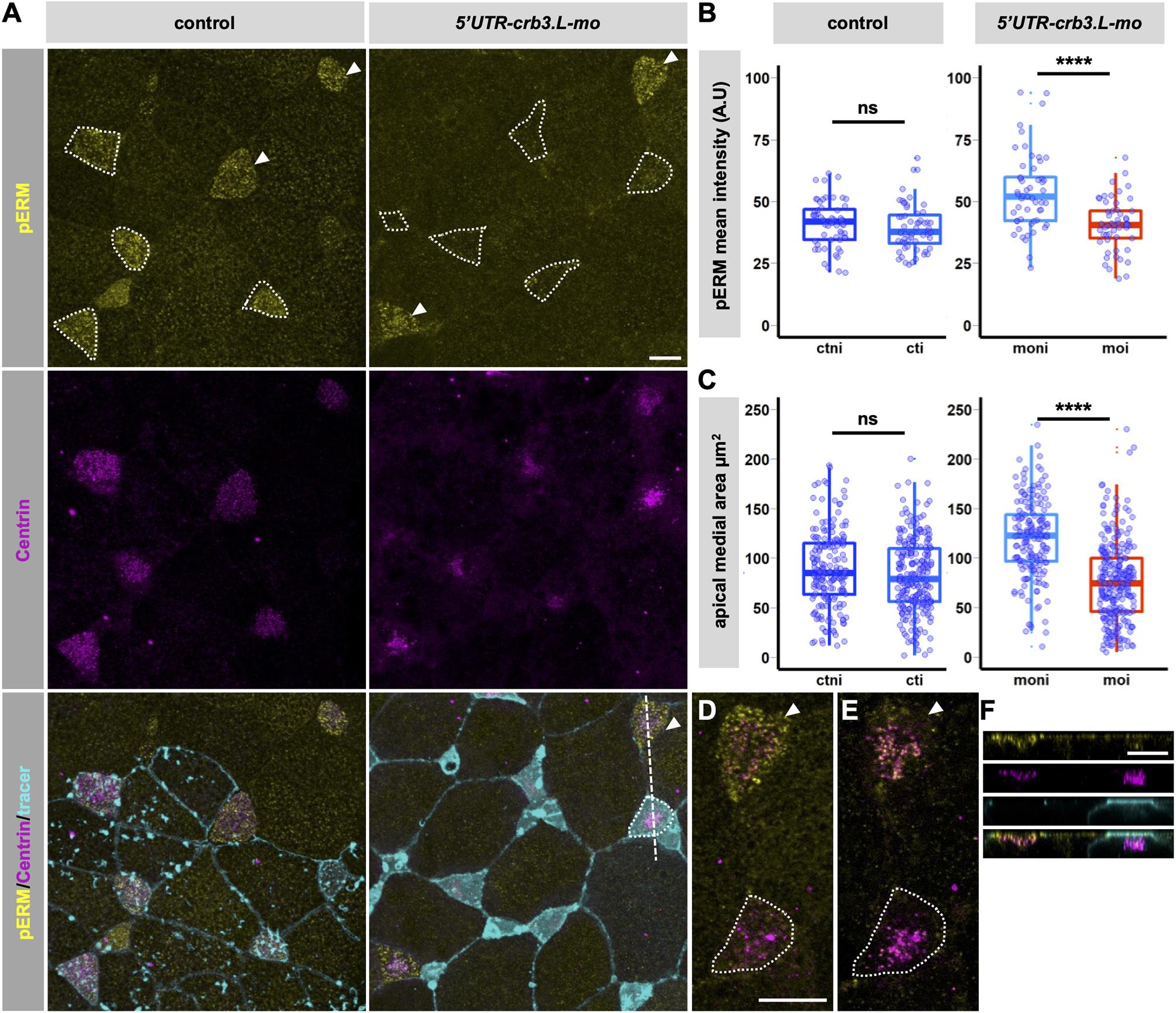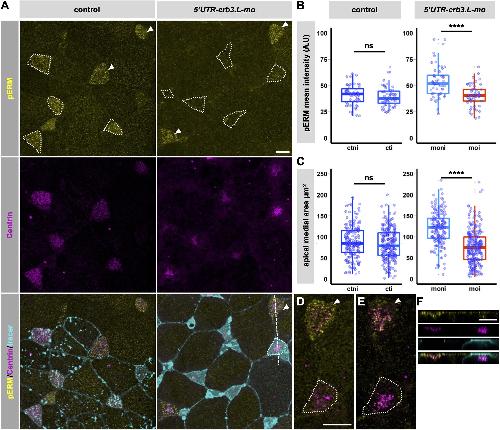 Fig. 6. Crb3.L regulates pERM at the developing apical surface of MCCs and is important for apical surface expansion. (A) Maximum intensity projection of a whole-mount mosaic tracer-injected control and 5′UTR-crb3.L morphant stained with anti-pERM antibodies. BBs are detected with anti-Centrin antibodies, GFP–GPI is the tracer for injected cells in control and morphant stage 21 embryos. Tracer injected or tracer plus morpholino-injected MCCs are encircled by dotted lines. Noninjected MCCs are indicated by white arrowheads. (B) Quantification (arbitrary units; A.U) of pERM intensity in mosaic control and 5′UTR-crb3L morphants. To avoid inter- and intra-embryo non-biological staining variations, only mosaic-injected regions were considered for quantification in control and 5′UTR-crb3.L morphants at stage 21. Mosaic frames containing more than two injected and two noninjected MCCs were used for quantification to allow calculation of the average intensity of pERM staining in each cell population per frame. Absence of variation of the staining in mosaic controls was a prerequisite for considering a variation observed in mosaic morphant as significant. Box plots present the average intensity of pERM staining per frame in MCCs of mosaic controls (left) and mosaic morphants (right). Pictures and graphs from one representative experiment out of three experiments (mosaic controls, n=9, 187 noninjected cells and 246 injected cells, 56 frames; mosaic morphants, n=9, 176 noninjected cells and 268 injected cells, 53 frames). (C) Quantification of the size of the apical domain in mosaic control and 5′UTR-crb3L morphants at stage 21. Measures are performed on the pictures selected for B. Absence of variation in the apical surface in mosaic controls was a prerequisite for considering a variation observed in mosaic morphant as significant. Tukey box plots present the distribution of the individual measures of apical surface in MCCs of mosaic controls (left) and mosaic morphants (right). Pictures and graphs from one representative experiment out of 3 experiments. Mosaic controls (n=9, 187 noninjected cells and 246 injected cells, 56 frames), mosaic morphants (n=9, 176 noninjected cells and 268 injected cells, 53 frames). Noninjected control MCCs, ctni; tracer-injected MCCs, cti; noninjected morphant MCCs, moni; 5′UTR-crb3L-morpholino plus tracer injected MCCs, moi. ****P<0.001; ns, not significant (unpaired two-tailed Student's t-test). (D–F) pERM recruitment at BBs in a mosaic morphant embryo. (D,E) Higher magnification of single focal plane at the level of the apical surface (D), and inside the cells at the level of ascending BBs (E). The noninjected cell is pointed by the white arrowhead, the injected cell is surrounded by the red dotted line. (F) x,z optical section according to dotted line in A; channel color code is the same as in A. Note that this configuration (noninjected and injected cells with similar apical surface and ascending BBs) is an extremely rare event making quantification of pERM at BBs difficult. Scale bars: 10 µm. |