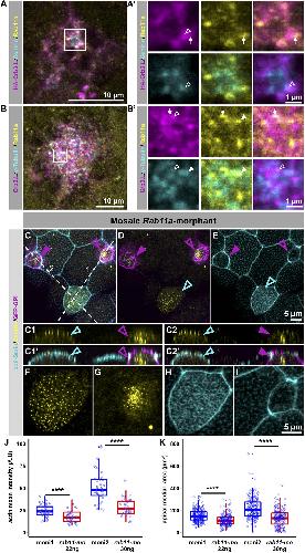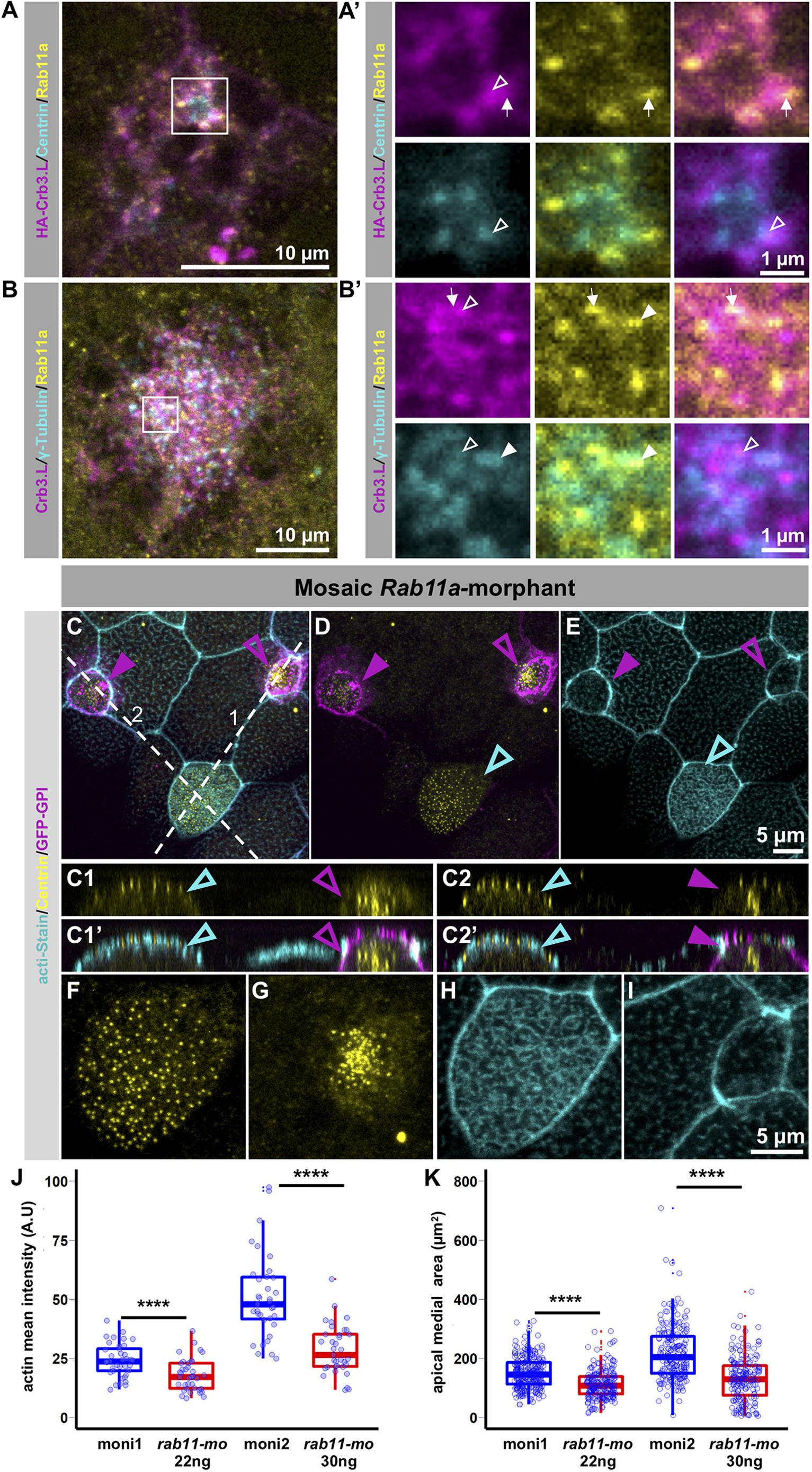 Fig. 7. Crb3.L and Rab11a might cooperate for centriole/BB ascension. (A) Single confocal section of an inserting MCC in a stage 20 embryo co-injected with centrin-RFP mRNA to label centrioles/BBs, and HA-crb3.L. HA-Crb3.L and endogenous Rab11a are detected with anti-HA and anti-Rab11a antibodies, respectively. (A′) Six cropped magnified micrographs of the ROI corresponding to the white square drawn in A. These inserts display separate channels and overlay for better appreciation of the localization of HA–Crb3.L regarding Rab11a vesicles and centrioles/BBs. (B) Single confocal section of an emerging MCC in a stage 20 wild-type embryo. BBs, endogenous Crb3.L, and endogenous Rab11a are respectively labeled with anti γ-Tubulin, anti Crb3.L and anti Rab11a antibodies. (B′) Six cropped magnified micrographs of the ROI corresponding to the white square drawn in B. Note the partial overlap of Rab11a with Crb3.L (white arrows), the partial overlap of Rab11a and γ-Tubulin or Centrin (white arrowheads), and the partial overlap of Crb3.L and Centrin (arrowheads with white outlines). (C–E) Maximum intensity projection of a whole-mount mosaic rab11a morphant. BBs are detected with anti-Centrin antibodies, F-actin is stained with the Acti-Stain™ probe, GFP–GPI is the tracer for injected cells. The noninjected MCC are indicated by an arrowhead outlined in cyan, whereas the two rab11a-morpholino injected cells are indicated by magenta arrowheads. Filled and outlined magenta arrowheads are used to distinguish the two Rab11a depleted cells on x,z optical confocal sections corresponding to the axis 1 and 2 drown in C. (D,C1–C2′,F,G) Displays of the centriole/BB phenotype. F and G are cropped magnified micrographies of D. F, Noninjected control MCC; G, rab11a-morpholino-injected MCC pointed by the arrowhead outlined in magenta. (H,I) Higher magnification of the actin meshwork. H, noninjected control MCC; I rab11a-morpholino injected MCC pointed by the arrowhead outlined in magenta. (J,K) Quantification of the actin cytoskeleton and apical medial area in mosaic rab11a-morphants. Graphs present the results of two independent experiments performed with two rab11a morpholino doses, experiment 1 with 22 ng, experiment 2 with 30 ng per blastomere. Measures were performed in control tracer (ct)-injected mosaic embryos and mosaic rab11a-morphants in stage 22 embryos. Absence of variation actin density and apical surface between noninjected and tracer injected cells was verified in control but is not presented on the graphs (experiment 1: ct, n=7, noninjected cells 193, injected cells 187, number of frames 33; morphants, n=8, noninjected cells 259, injected cells 201, number of frames 37; experiment 2, ct n=4, noninjected cells 75, injected cells 79, number of frames 13; morphants, n=8, noninjected cells 191, injected cells 177, number of frames 35). Experiment 1: noninjected morphant MCCs, moni1; rab11a morpholino plus tracer-injected MCCs (mo 22 ng). Experiment 2: noninjected morphant MCCs, moni2; rab11a morpholino plues tracer-injected MCCs (mo 30 ng). (J) Quantification of the actin cytoskeleton defect. Medial regions were manually delineated excluding the junctions, mean actin intensity was measured with Fiji and is presented in arbitrary units (A.U). (K) Quantification of the apical medial area. The apical medial area delimited by the apical cell–cell junction, is a proxi for the apical cell surface. Results are presented as Tukey box plots. ****P<0.001 (Wilcoxon test). |