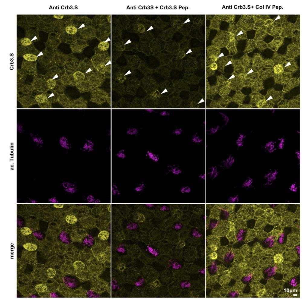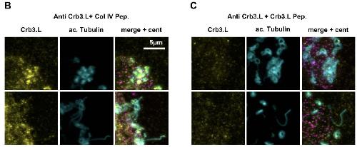 Fig.S2.Crb3.L antibody staining is lost in immunogenic peptide competition assay ( see previous figure for panel A) B-C: Higher magnification focusing on cilia. Cilia were labelled with anti-acetylated a-Tubulin antibody. Note Crb3.L spotted staining on cilia when the Crb3.L antibody is preincubated with a none-related peptide. C: Note the disappearance of the ciliary signal upon immunogenic peptide competition. |
