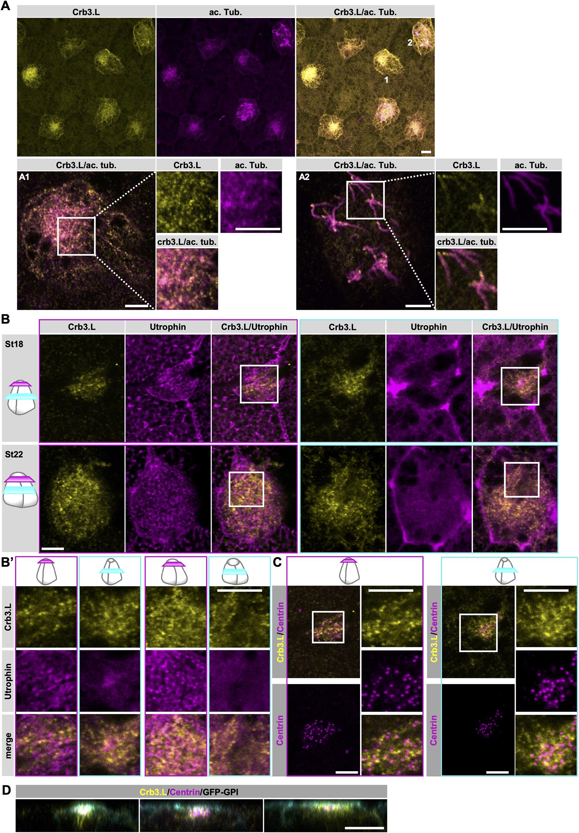 Fig. 1. Crb3.L is expressed in MCCs expanding their apical surface and during ciliogenesis. (AD) Micrographs of MCCs during insertion, expansion of the apical domain and early ciliogenesis in stage 18 Xenopus embryos. Crb3.L is labeled with our custom-made anti-Crb3.L antibody. (A) Crb3.L vesicles are in close association with microtubular tracks in MCCs. Maximal intensity projection of an en face view of a whole-mount of stage 18 Xenopus laevis embryos at low magnification. Stable microtubules are labeled with anti-acetylated -tubulin antibodies (ac. Tub.). (A1, A2) Single confocal sections at higher magnification of the MCC 1 and 2 annotated in A. The A1 section is at the level of the tubulin network in the cell 1 sub-apical domain. The A2 section at the level of cilia in cell 2. Inserts on the right-side panel A1 and A2 are cropped magnified micrographs of the ROI, corresponding to white squares drawn in A1 and A2. Panels on the display separate channels and overlay for better appreciation of the localization of Crb3.L regarding stable microtubules. Note the dotty staining of Crb3.L following microtubule tracks in the cytoplasm (A1) and the ciliary axoneme (A2). (B) Crb3.L vesicles localize within the remodeling actin meshworks in MCCs. F-actin is labeled via injection of utrophin-gfp mRNA (Utrophin). Upper row, single x,y confocal sections of an emerging MCC (apical surface 63m2) in a stage 18 embryo. Magenta framed panels are at the level of the newly formed apical domain as depicted on the scheme (magenta line indicates the level of the section). Cyan frame panels are at the level of the internal actin meshwork as depicted on the scheme (cyan line indicates the level of the section). Lower row, single x,y confocal sections of an emerged MCC (apical surface 178m2) in a stage 22 embryo. Magenta framed panels are at the level of the maturing apical actin meshwork as depicted on the scheme (magenta line indicates the level of the section). Cyan frame panels are at the level of the internal actin meshwork as depicted on the scheme (cyan line indicates the level of the section). (B) Cropped magnified micrographs of the ROI, corresponding to white squares drawn in B; cells and levels of section are indicated on the scheme heading for each column. (C) Crb3.L vesicles localize in the vicinity of the ascending centrioles. Centrioles and BBs are labeled by anti-Centrin antibodies. Single x,y confocal sections of the stage 18 MCC shown in B. Magenta framed panels are at the level of the centrioles/BBs that have reached the apical domain as depicted on the scheme (magenta line indicates the level of the section). Cyan frame panels are at the level of the internal centrioles/BBs as depicted on the scheme (cyan line indicates the level of the section). (D) Crb3.L localization changes are synchronous to centriole/BB ascension and apical surface emergence in MCCs. x,z optical sections through a series of MCCs with expanding apical surface. Micrographs are ranked from the smallest (left) to the largest apical cell surface. Note the progressive shift of Crb3.L from an internal position when centrioles/BBs are deep in the cytoplasm to the apical domain when BBs are docked at the apical surface. Images are representative of more than three repeats. Scale bars: 10m. |