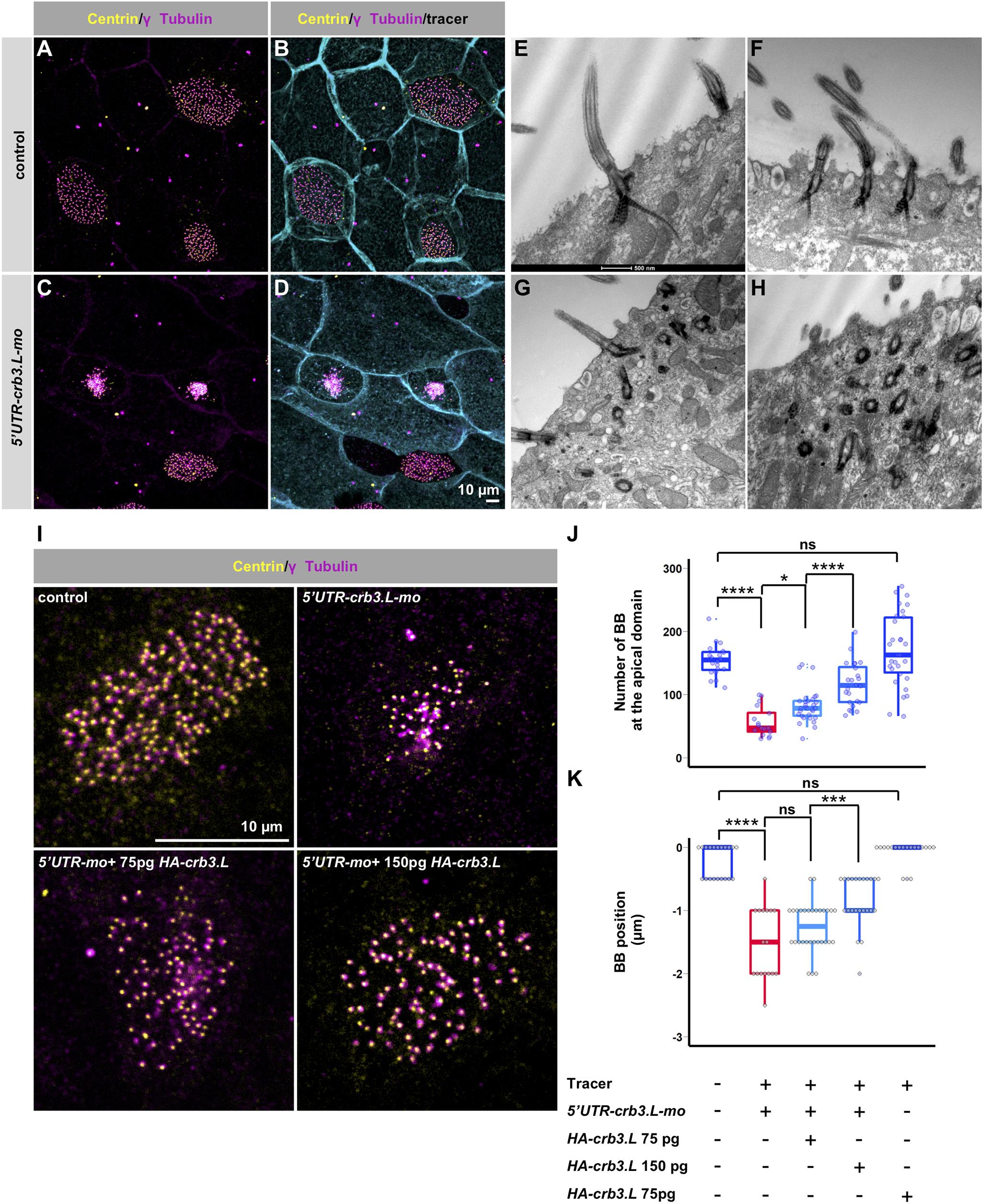 Fig. 3. crb3.L is required for proper BB migration and docking. (A–D) Maximum intensity projections of en face view stage 28 embryos. BBs are labeled with anti-Centrin (centriole) and anti-γ-Tubulin (basal foot) antibodies. Control embryos are injected with 200 pg of GFP-GPI mRNA, morphants are co-injected with 200 pg of GFP-GPI mRNA and 15 ng of 5′UTR-crb3.L-mo. (E–H) TEM pictures of the skin of stage 28 embryos. (E,F) Control embryos. (G,H) Morphant embryos. Note the even distribution of BBs covering most of the apical surface in control embryos (A,B,F,I), whereas in morphant embryos apically located BBs occupy a restricted part of the cell surface, are clumped together and stay deep in the cytoplasm (C,G,H). Images in A–D are representatives of more than three repeats, TEM pictures in E–H are representative of one experiment. (I–K) Rescue experiment showing correction of the BB migration/docking defect with morpholino insensitive HA-tagged crb3.L mRNA. (I) Most apical slice of a representative MCC, in the four injection conditions: control (no injection), co-injection of 15 ng 5′UTR-crb3.L-mo and tracer, co injection of 15 ng 5′UTR-crb3.L-mo and 75 pg HA-crb3.L mRNA and tracer, co-injection of 15 ng 5′UTR-crb3.L-mo and 150 pg HA-crb3.L mRNA and tracer. (J,K) To assess the rescue, we estimated two parameters: the number of BBs docked on the apical surface (upper graph J) and the position of the BBs relative to the cell apical surface (lower graph K). Injection conditions are common to the two graphs, and are depicted below the BBs position graph. mo refers to 5′UTR-crb3L-mo. (J) The number of apically located BBs was automatically counted with the find maxima tool of the Fiji software. (K) To estimate BB position relative to the apical cell surface, the number of planes occupied by at least three BBs were counted. Noninjected control (n=20), co-injection 15 ng of 5′UTR-crb3L-mo and tracer (n=19), co-injection of 15 ng 5′UTR-crb3L-mo and 75 pg HA-crb3.L mRNA and tracer (n=24), co-injection of 15 ng 5′UTR-crb3L-mo and 150 pg HA-crb3.L mRNA and tracer (n=32), 75 pg HA-crb3.L mRNA (n=21), n=number of cells. Results are presented as Tukey box plots. *P<0.05, ***P<0.005, ****P<0.001; ns, not significant (Kruskal–Wallis test with post hoc Wilcoxon test with Bonferroni correction). |