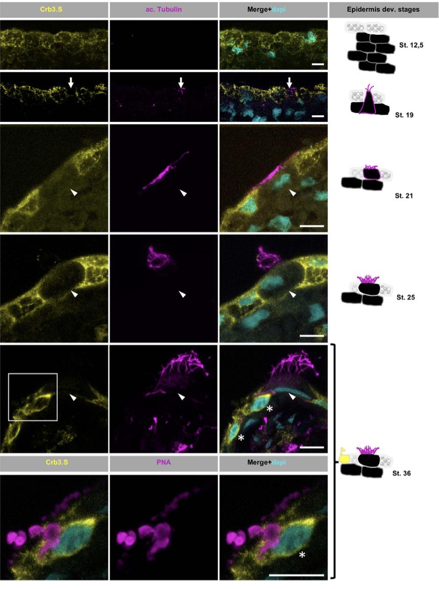 Fig. S1. Crb3.S has an early, dynamic, and wide expression during morphogenesis of the mucociliary epidermis A : Frozen sections displaying Crb3.S custom-made antibody staining during morphogenesis of the mucociliary epidermis. Schemes on the right depict Xenopus epidermis morphogenetic changes according to the developmental stages. Nuclear staining is DAPI, cilia are labelled with anti-acetylated a-Tubulin (ac-Tubulin), peanut agglutin (PNA) stains small and large secretory vesicles of goblet cells and SSCs, respectively. (white arrows) newly formed cilia, (white arrowheads): MCC, (stars): SSC. Scale bars are 10 μm. |