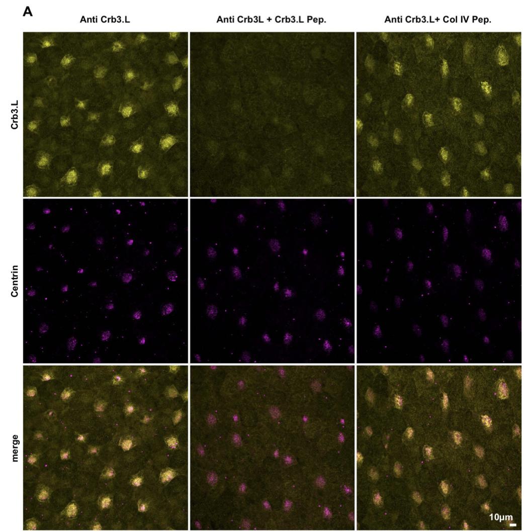 Fig.S2.Crb3.L antibody staining is lost in immunogenic peptide competition assay. A. Maximal intensity projection of whole-mount St 20-21 Xenopus laevis embryonic mucociliary epidermis stained with anti Crb3.L antibody in control condition, in competitive condition with the addition of the immunogenic peptide, in control condition with the addition of an unrelated peptide (Oopsacas. minuta type IV collagen). The ratio between antibody and peptides was 1 to 25 moles. BBs were labelled with anti-Centrin antibody. Crb3.L staining in MCCs is efficiently decreased upon competition with the immunogenic peptide. ( see next figure for panels B and C) |
