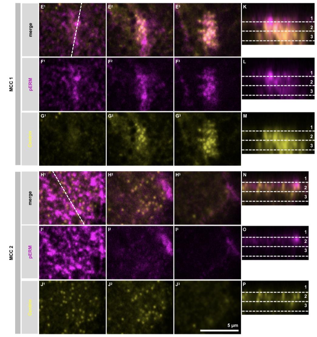 Fig. S5. pERM is transiently recruited at BBs during their ascension. (continued) (E1-J3) confocal x, y planes of the apical surfaces and two intracytoplasmic x, y sections of increasing depth are presented for MCC 1 and MCC 2. (E1, F1, G1, H1, I1, J1) are the most apical planes. (K-P) are x, z optical confocal sections of MCC 1 and MCC 2. (E1-P) Precise coordinates of each confocal sections are explained below. In E1 the dotted line indicates the x, z axis for the optical sections presented in K, L, M. In H1 the dotted line indicates the x, z axis for the optical sections presented in N, O, P. The dotted lines (1, 2, 3) in (K-P) indicate the level of the x, y sections presented in (E1-J3). |
