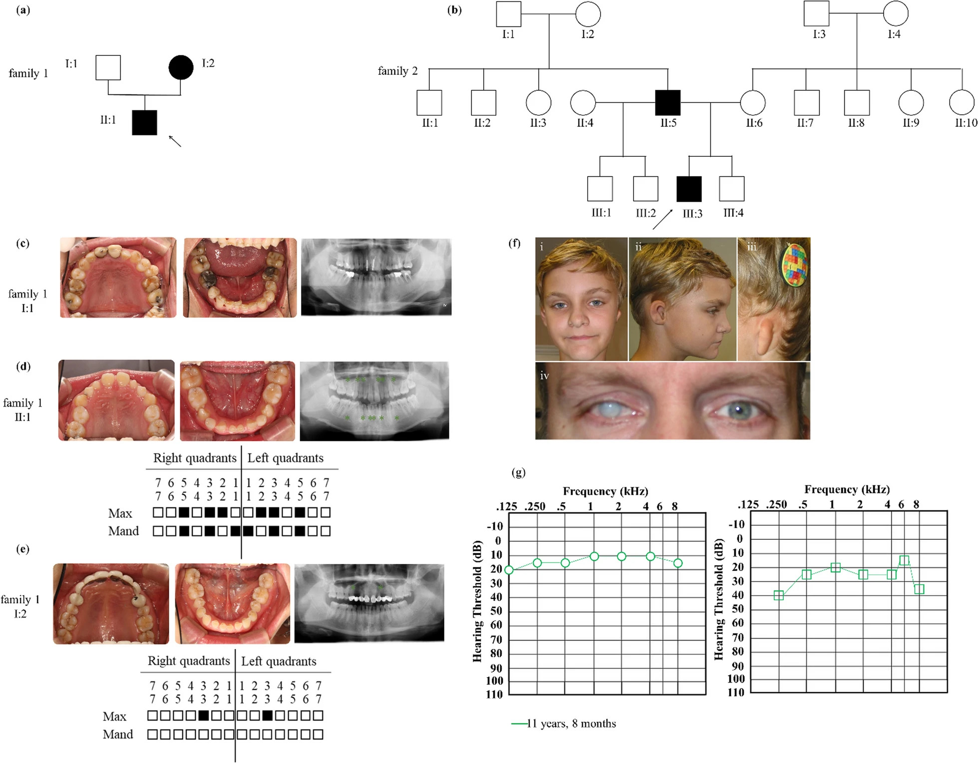 Pedigrees and phenotypes in the families. a Pedigree of family 1. The proband (II:1) is a 9-year-old boy with NSTA. b Pedigree of family 2. The proband (III:3) is an 11-year-old boy with agenesis of eight permanent teeth, auricular dysplasia, hearing impairment and further findings of olfactory dysfunction. Square, male; circle, female; black, patient; arrow, proband. c–e Intra-oral photographs and panoramic radiographs of individuals from family 1. Schematic of congenitally missing teeth of proband and his mother. Asterisks and solid squares indicate the congenitally missing teeth. Max, maxillary; Mand, mandibular. f Photographs of the proband and father in family 2. (i) Frontal view, (ii) right profile and ear and (iii) left profile and ear. First- and third-degree microtia of the right and leftear, respectively. (iv) Mature cataract in the righteye of the father. g Pure-tone audiometry of the proband in family 2 following bone-conduction implantation, note normal hearing on the rightear and mild hearing loss on the left ear