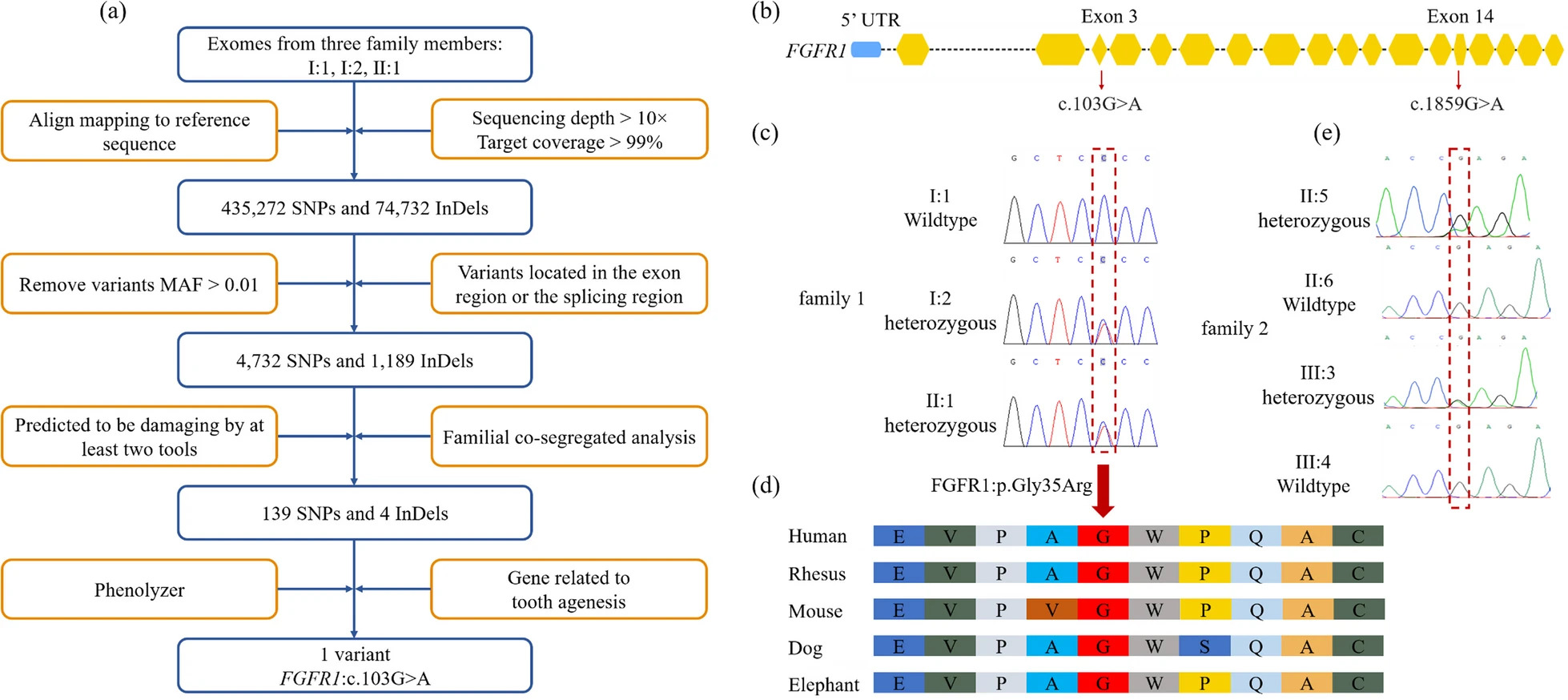 Fig. 2 a Flow chart outlining selection of the causative variant. b Schematic diagram of the gene location of the damaging allele. c Sanger sequencing of the heterozygous c.103G>A (I:2 and II:1) and wildtype (I:1) alleles in the FGFR1 gene. Red dotted frames indicate the positions of causative variants. d Conservation of each amino acid residue across species is shown. The red arrow indicates the mutated amino acid. Glycine at position 35 is conserved. e Sanger sequencing of the heterozygous c.1859G>A (II:5 and III:3) and wildtype (II:6 and III:4) alleles in the FGFR1 gene. Red dotted frame indicates the position of causative variants