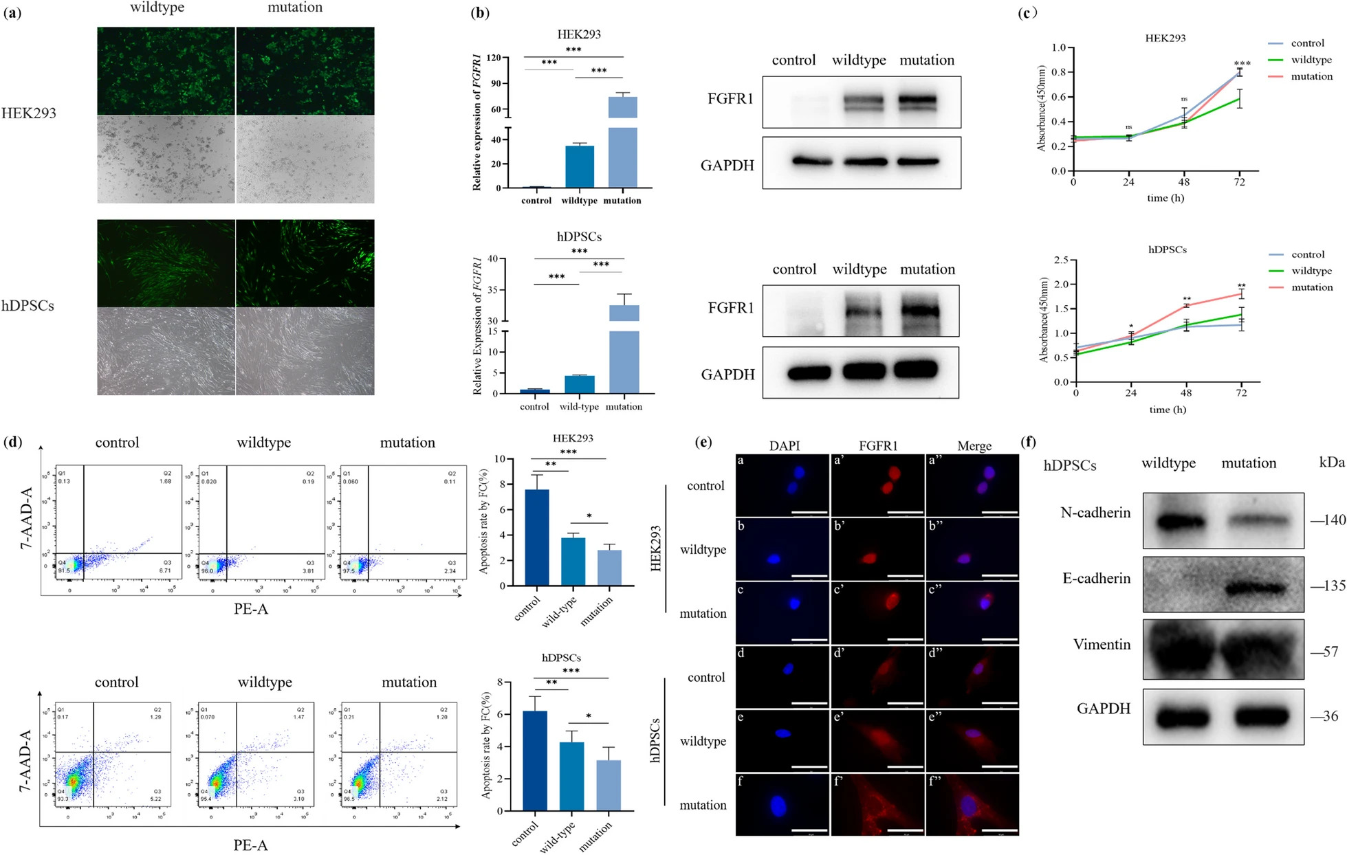 Fig. 3. The variant FGFR1 (c.103G>A) promotes the expression of FGFR1 and proliferation, reduces apoptosis and affects the process of EMT in HEK293 and hDPSCs. a The fluorescence image shows the transfection efficiency of lentiviruses. b Protein and mRNA levels of FGFR1 were detected after transfection with FGFR1 overexpression lentivirus (control, wildtype and mutation). c Cell counting kit-8 assay was used to assess the proliferation after transfection with lentivirus (control, wildtype and mutation). d Quantitative analysis of cell apoptosis by flow cytometry between the three groups (control, wildtype and mutation). e Subcellular localization of wildtype or mutated FGFR1 in the HEK293 and hDPSCs. a'-f' Nuclei stanning by DAPI. b"-h" Merge of FGFR1 and DAPI. FGFR1 (red); nuclei (blue). Scale bars: 50 m. f Protein levels of EMT markers E-cadherin, N-cadherin and Vimentin in the cells transfected by wildtype and mutation lentivirus were assayed by western blot